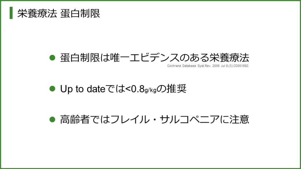 #65. 栄養療法 蛋白制限 蛋白制限は唯一エビデンスのある栄養療法 Up to dateでは<0.8g/kgの推奨 高齢者ではフレイル・サルコペニアに注意 Cochrane Database Syst Rev. 2009 Jul 8;(3):CD001892.