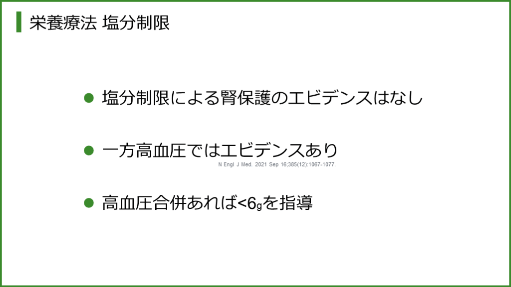 #66. 栄養療法 塩分制限 塩分制限による腎保護のエビデンスはなし 一方高血圧ではエビデンスあり 高血圧合併あれば<6gを指導 N Engl J Med. 2021 Sep 16;385(12):1067-1077.