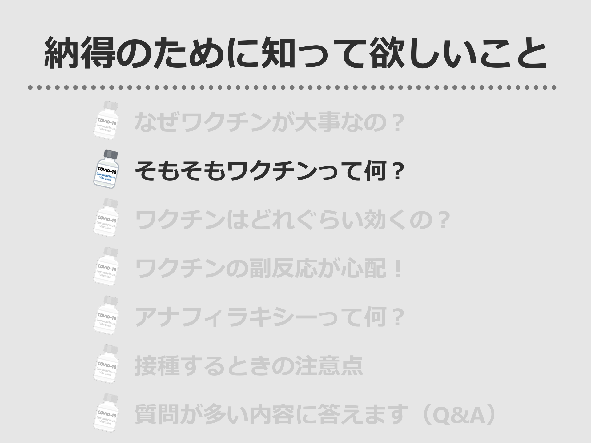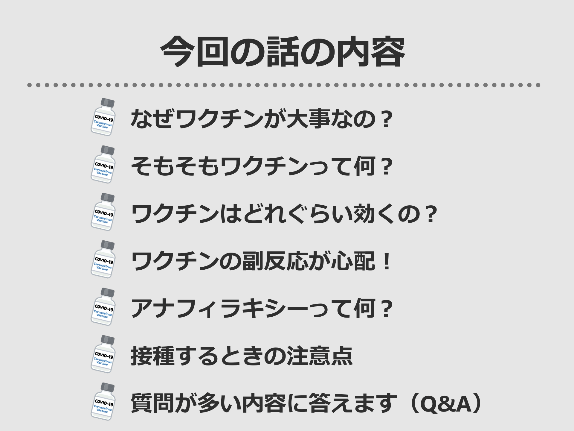 #63. 今回の話の内容 なぜワクチンが大事なの? そもそもワクチンって何? ワクチンはどれぐらい効くの? ワクチンの副反応が心配! アナフィラキシーって何? 接種するときの注意点 質問が多い内容に答えます(Q&A)