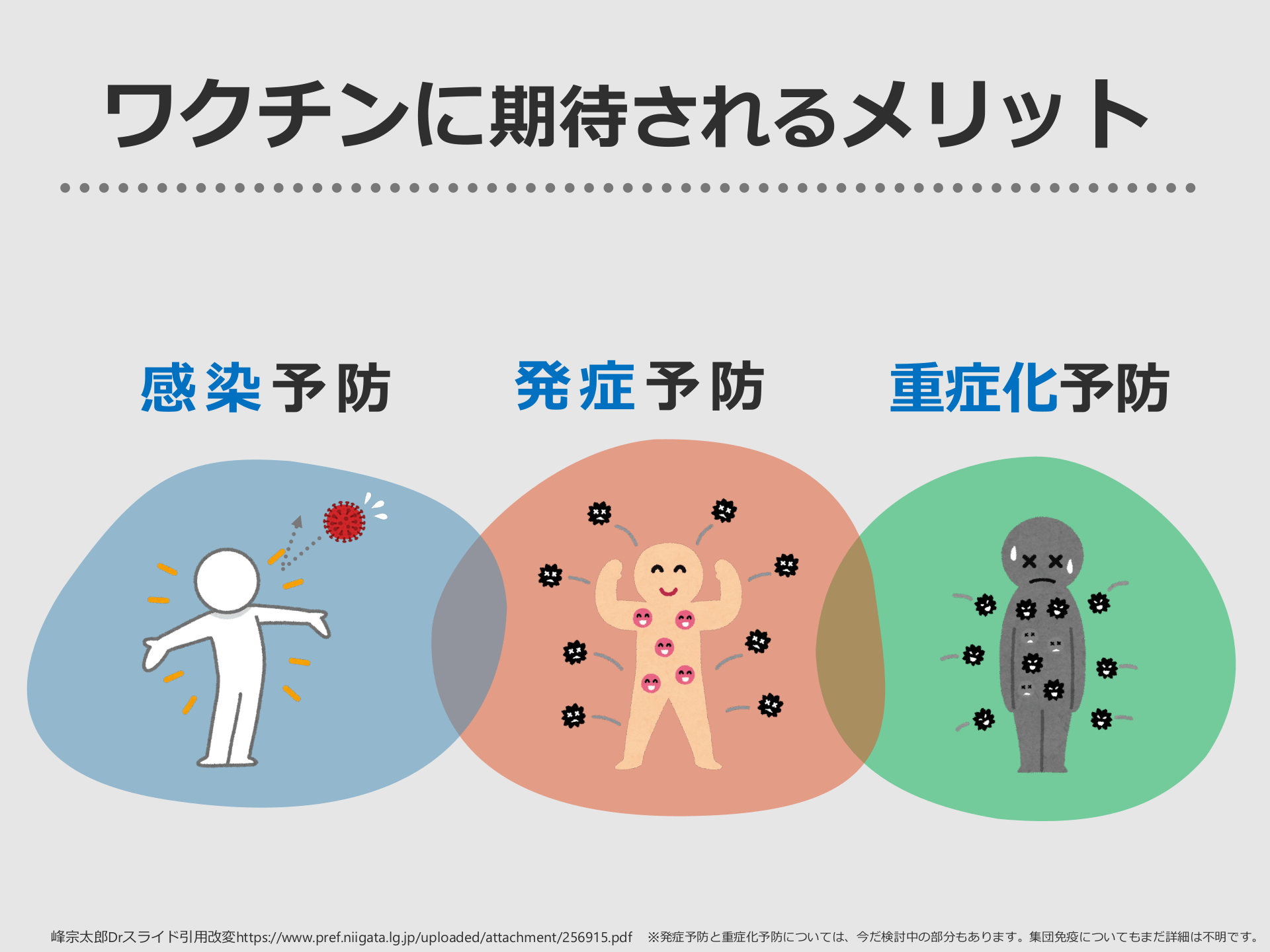 #14. ワクチンに期待されるメリット 感染予防 発症予防 峰宗太郎Drスライド引用改変https://www.pref.niigata.lg.jp/uploaded/attachment/256915.pdf 重症化予防 ※発症予防と重症化予防については、今だ検討中の部分もあります。集団免疫についてもまだ詳細は不明です。