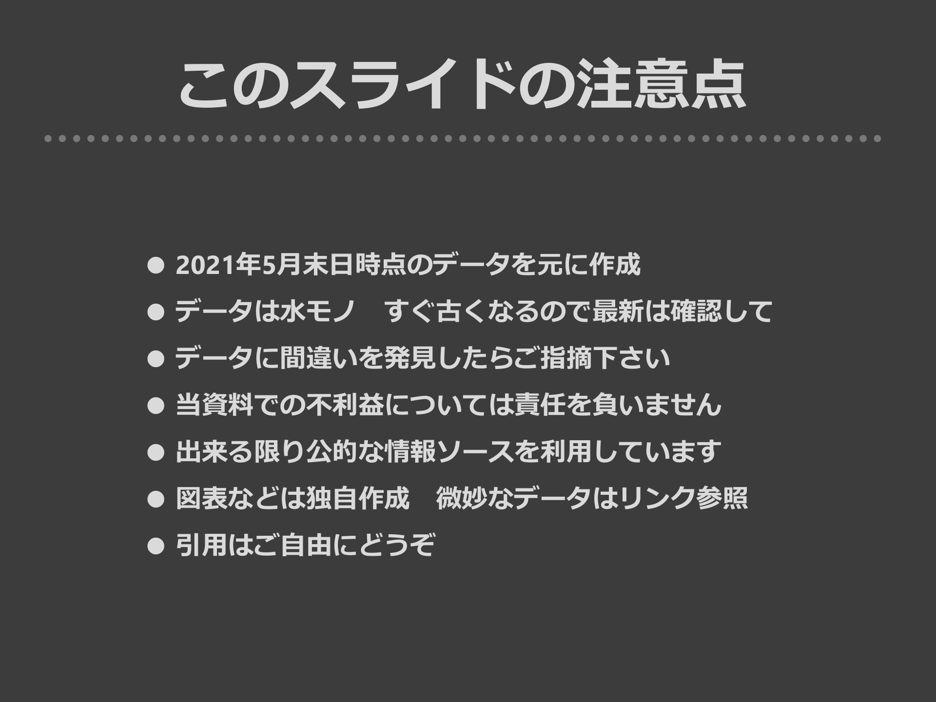 #2. このスライドの注意点 ● 2021年5月末日時点のデータを元に作成 ● データは水モノ すぐ古くなるので最新は確認して ● データに間違いを発見したらご指摘下さい ● 当資料での不利益については責任を負いません ● 出来る限り公的な情報ソースを利用しています ● 図表などは独自作成 微妙なデータはリンク参照 ● 引用はご自由にどうぞ