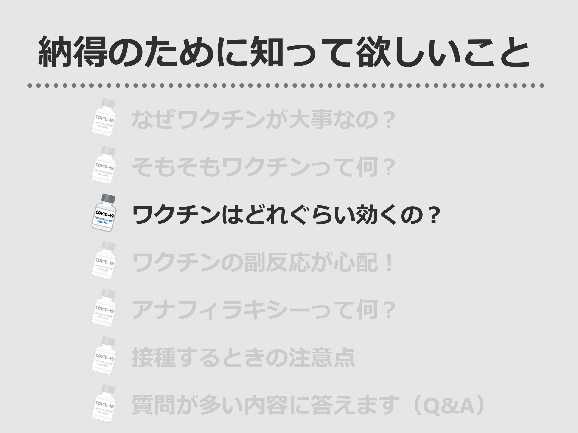 #3. 納得のために知って欲しいこと なぜワクチンが大事なの? そもそもワクチンって何? ワクチンはどれぐらい効くの? ワクチンの副反応が心配! アナフィラキシーって何? 接種するときの注意点 質問が多い内容に答えます(Q&A)