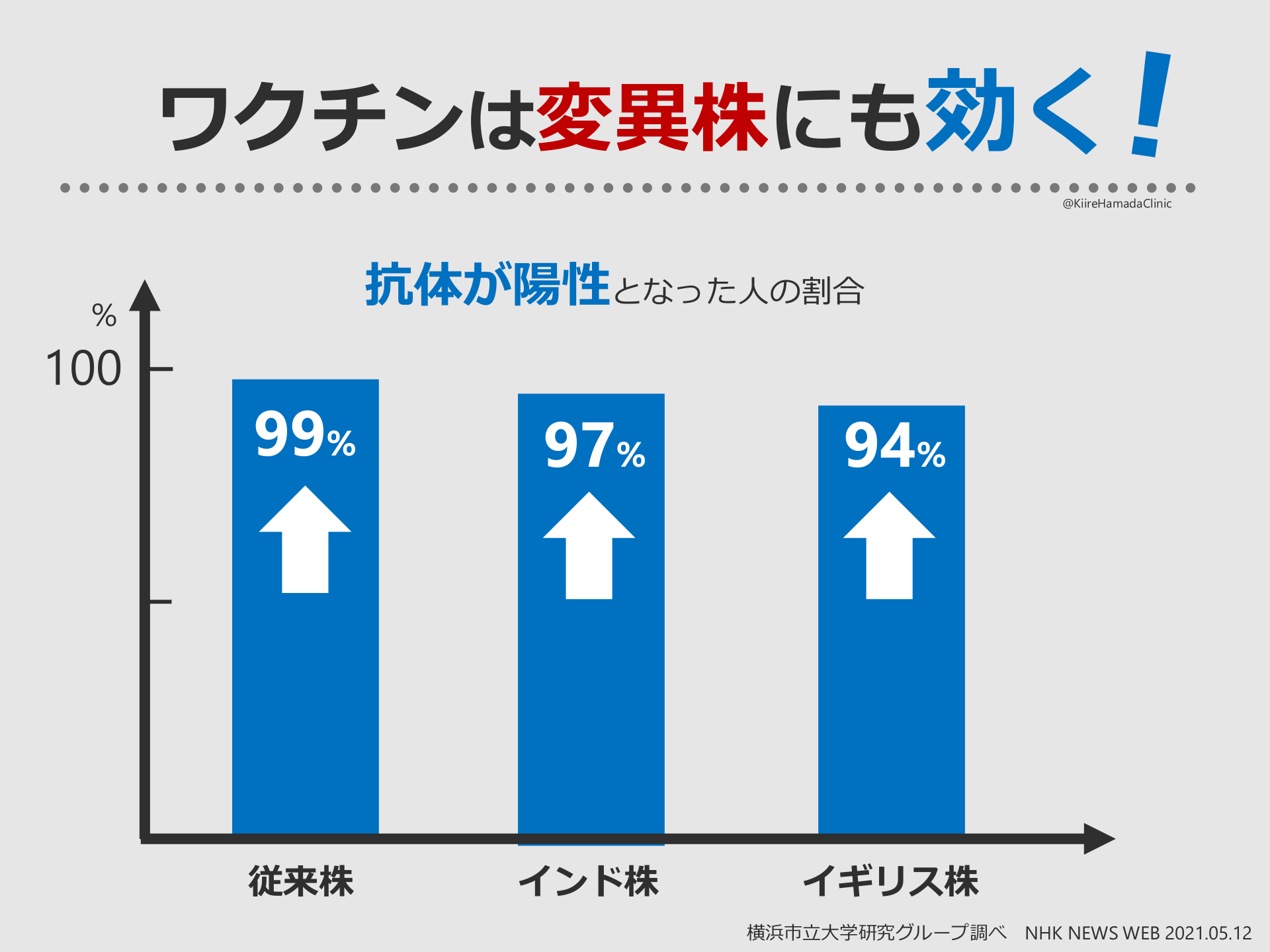 #25. ワクチンは変異株にも効く @KiireHamadaClinic 抗体が陽性となった人の割合 % 100 99% 97% 94% 従来株 インド株 イギリス株 横浜市立大学研究グループ調べ NHK NEWS WEB 2021.05.12