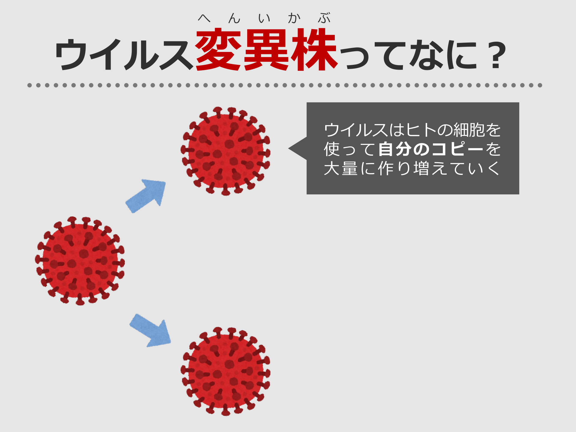 #26. へ ん い か ぶ ウイルス変異株ってなに? ウイルスはヒトの細胞を 使って自分のコピーを 大量に作り増えていく