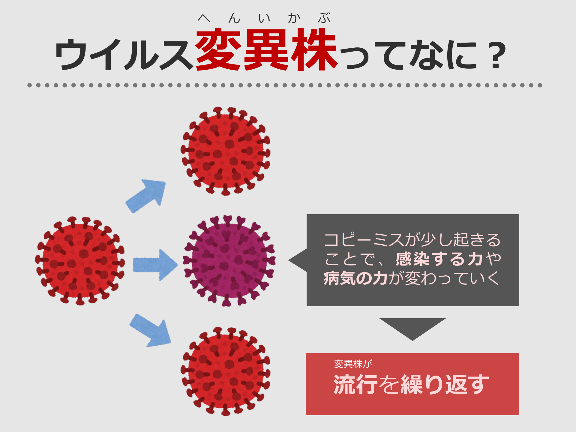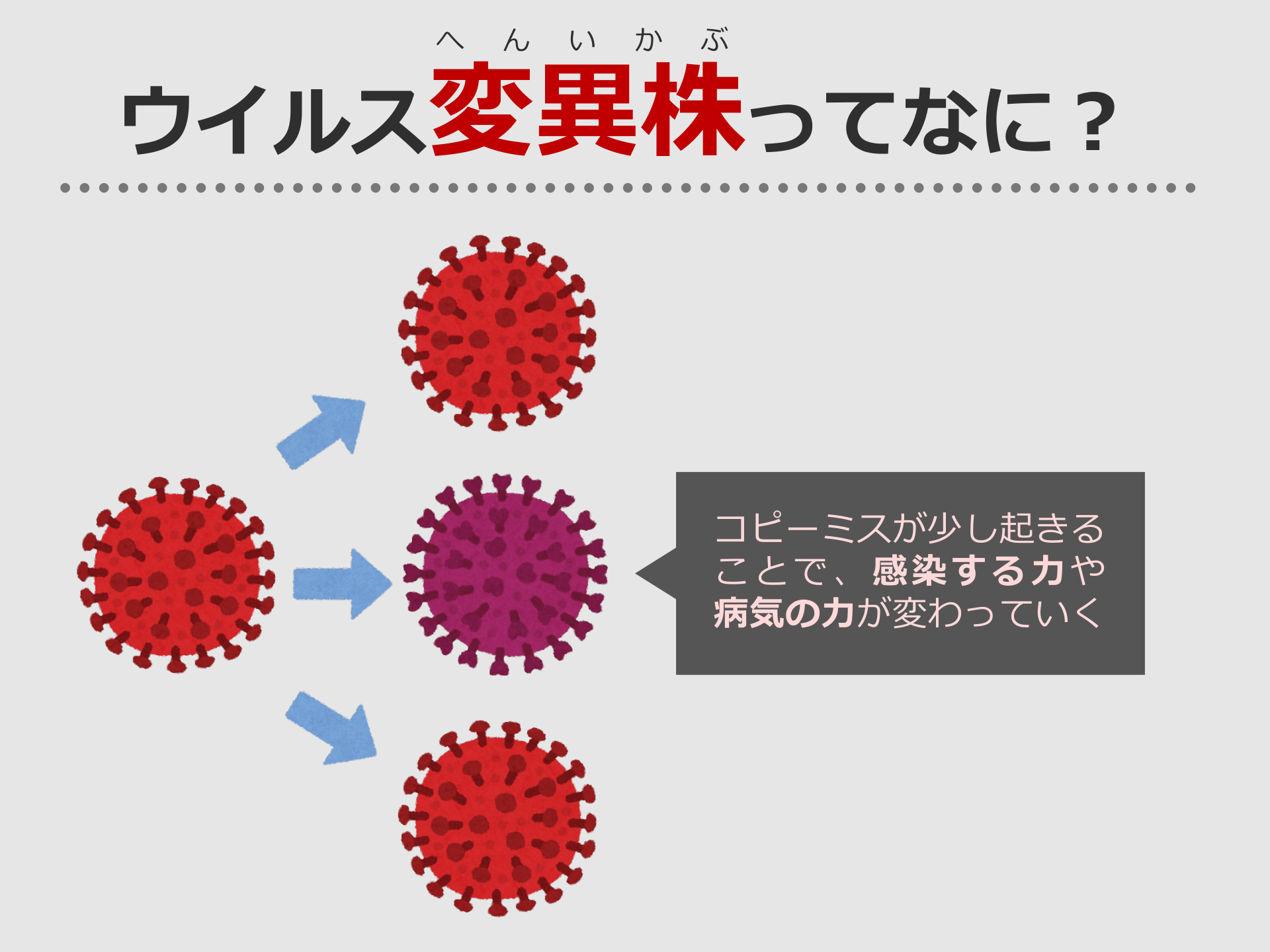 #28. へ ん い か ぶ ウイルス変異株ってなに? コピーミスが少し起きる ことで、感染する力や 病気の力が変わっていく 変異株が 流行を繰り返す