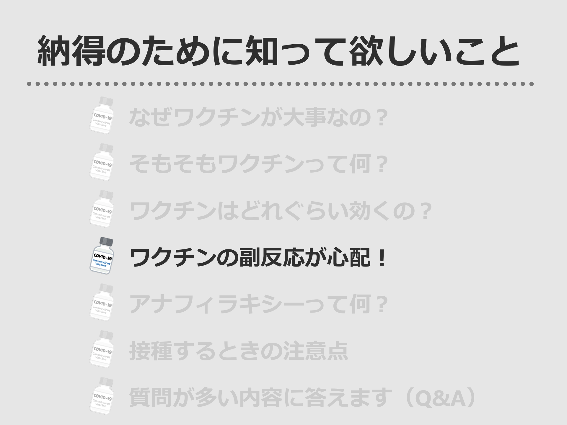 #4. 納得のために知って欲しいこと なぜワクチンが大事なの? そもそもワクチンって何? ワクチンはどれぐらい効くの? ワクチンの副反応が心配! アナフィラキシーって何? 接種するときの注意点 質問が多い内容に答えます(Q&A)