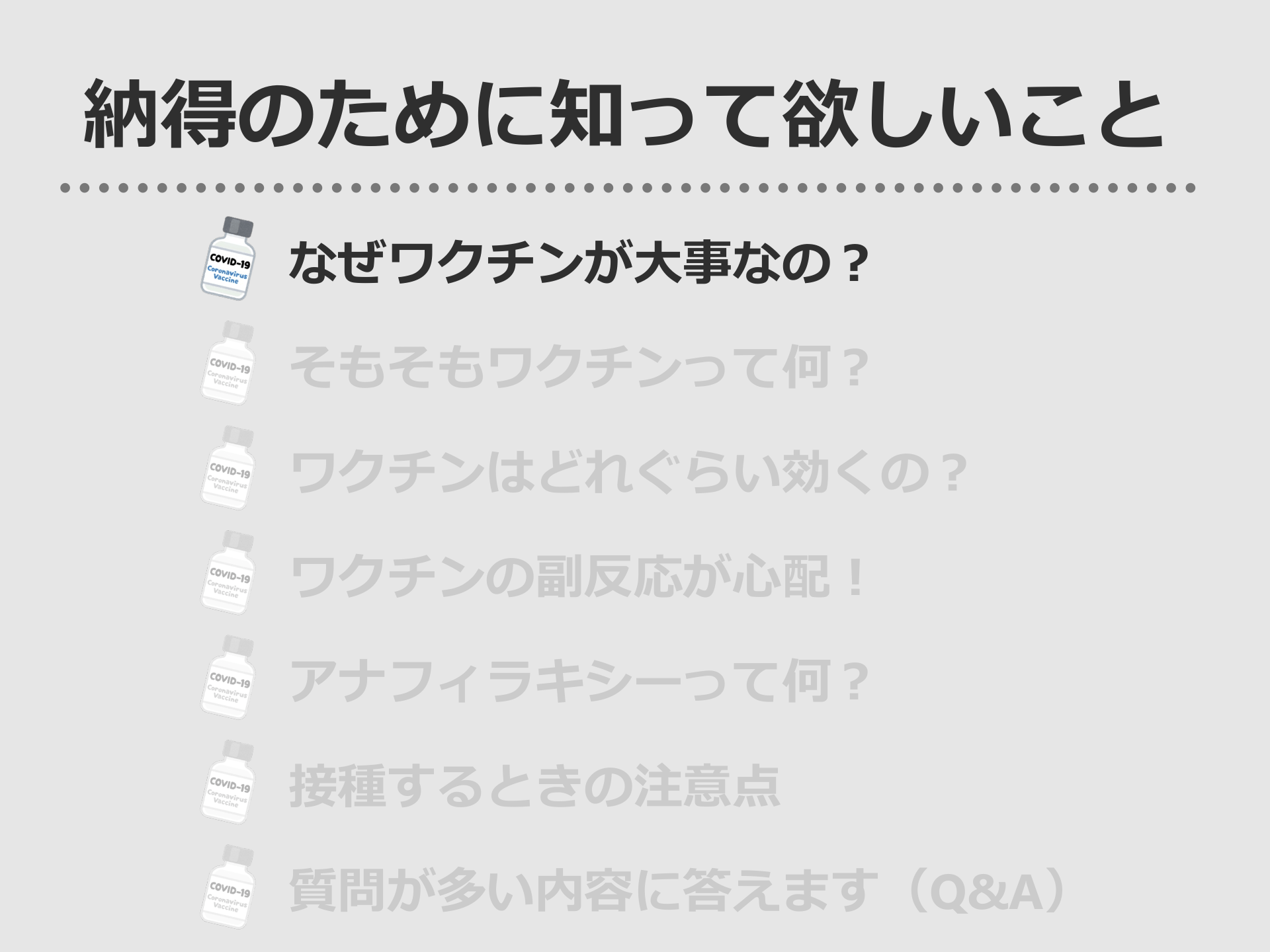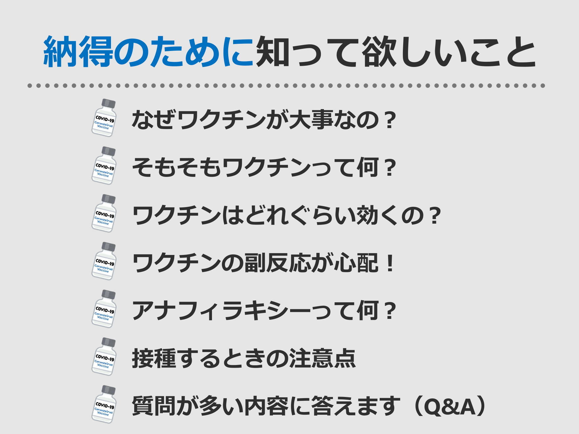#22. 納得のために知って欲しいこと なぜワクチンが大事なの? そもそもワクチンって何? ワクチンはどれぐらい効くの? ワクチンの副反応が心配! アナフィラキシーって何? 接種するときの注意点 質問が多い内容に答えます(Q&A)