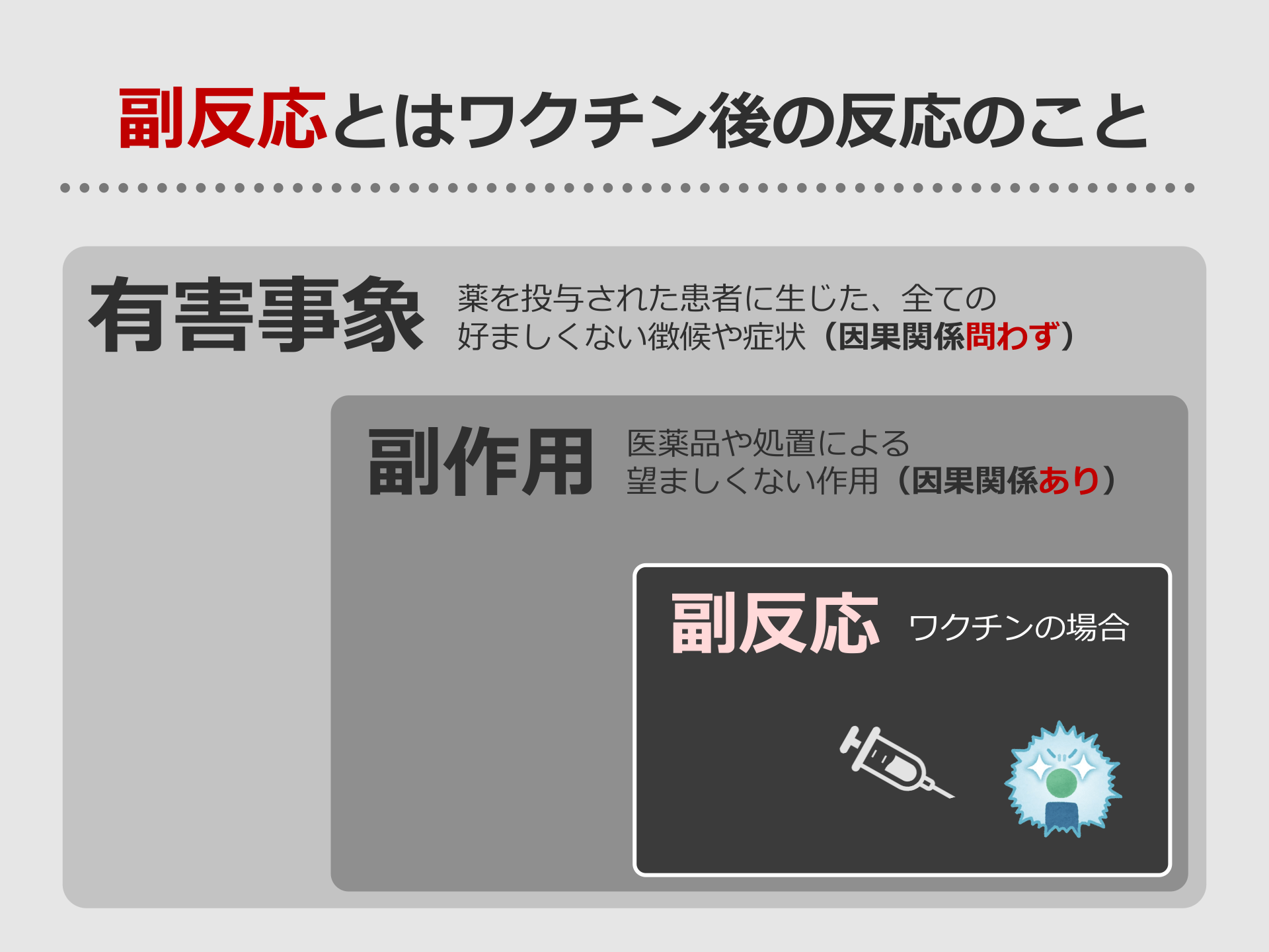 #31. 副反応とはワクチン後の反応のこと 有害事象 薬を投与された患者に生じた、全ての 好ましくない徴候や症状(因果関係問わず) 副作用 医薬品や処置による 望ましくない作用(因果関係あり) 副反応 ワクチンの場合