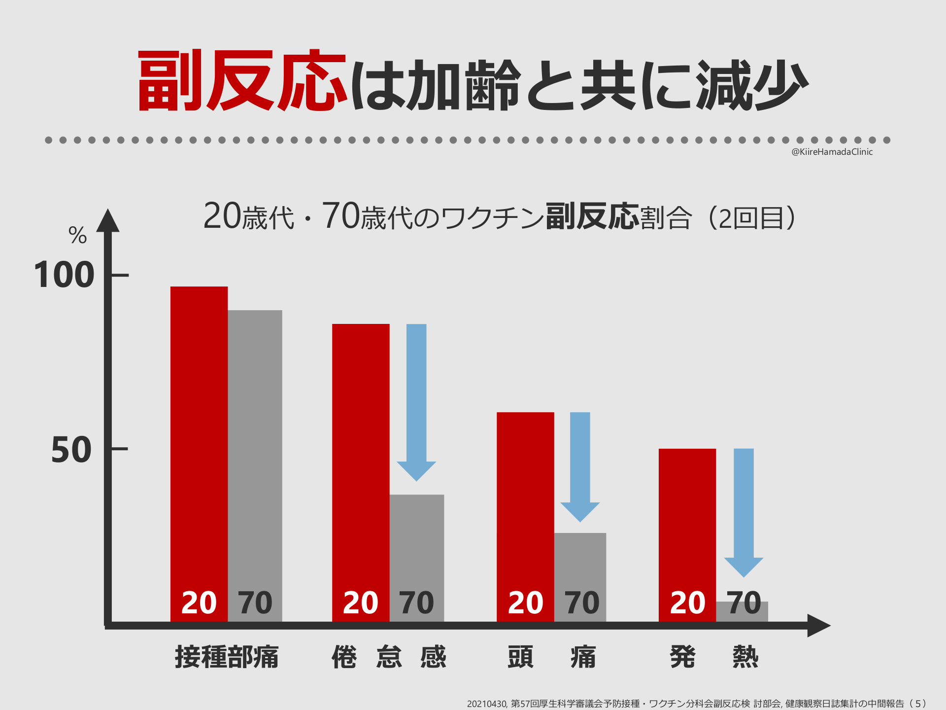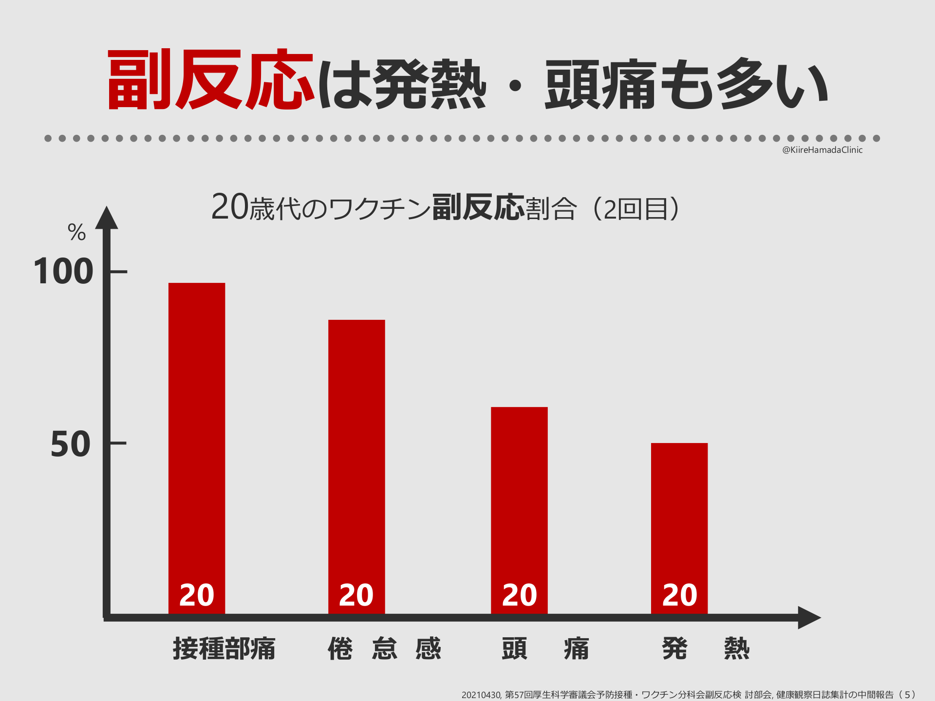 #32. 副反応は発熱・頭痛も多い @KiireHamadaClinic % 20歳代のワクチン副反応割合(2回目) 100 50 20 接種部痛 20 倦 怠 感 20 頭 20 痛 発 熱 20210430, 第57回厚生科学審議会予防接種・ワクチン分科会副反応検 討部会, 健康観察日誌集計の中間報告(5)