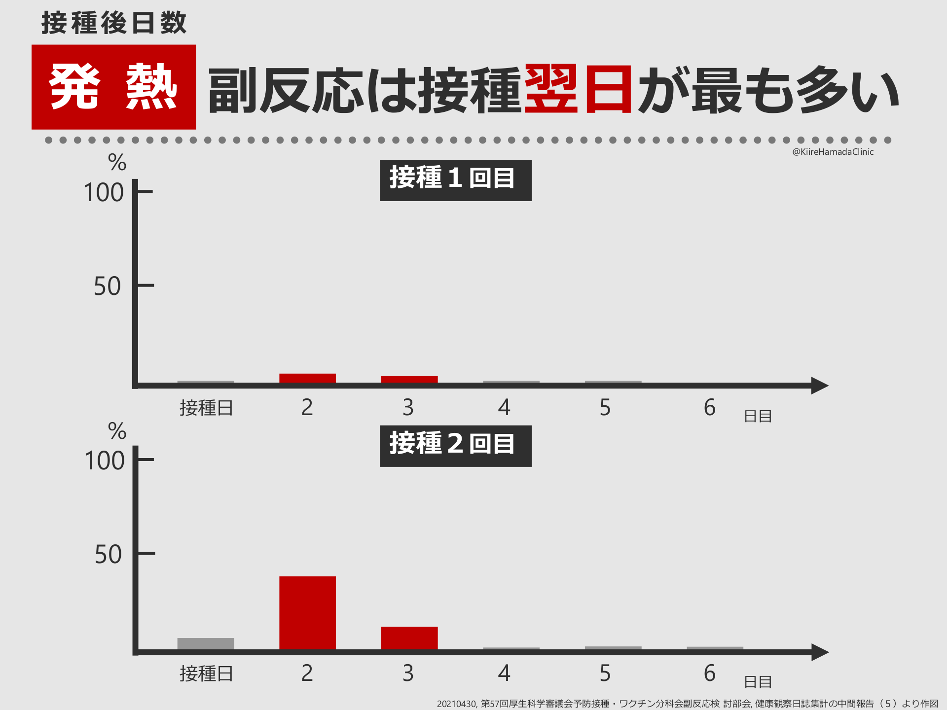 #34. 接種後日数 発 熱 副反応は接種翌日が最も多い % @KiireHamadaClinic 接種1回目 100 50 % 接種日 2 100 3 4 5 6 日目 3 4 5 6 日目 接種2回目 50 接種日 2 20210430, 第57回厚生科学審議会予防接種・ワクチン分科会副反応検 討部会, 健康観察日誌集計の中間報告(5)より作図