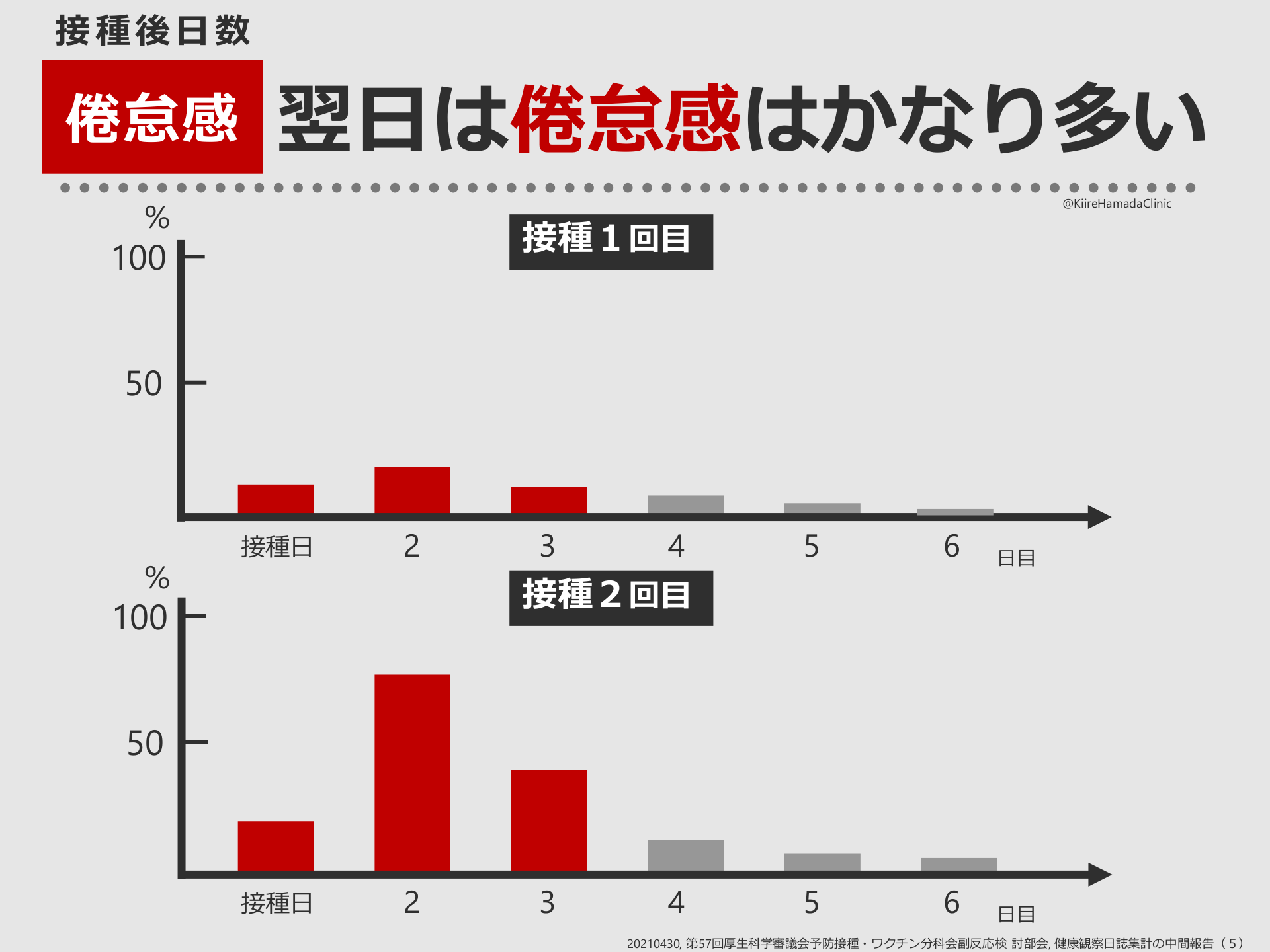 #36. 接種後日数 倦怠感 翌日は倦怠感はかなり多い % @KiireHamadaClinic 接種1回目 100 50 % 接種日 2 100 3 4 5 6 日目 3 4 5 6 日目 接種2回目 50 接種日 2 20210430, 第57回厚生科学審議会予防接種・ワクチン分科会副反応検 討部会, 健康観察日誌集計の中間報告(5)