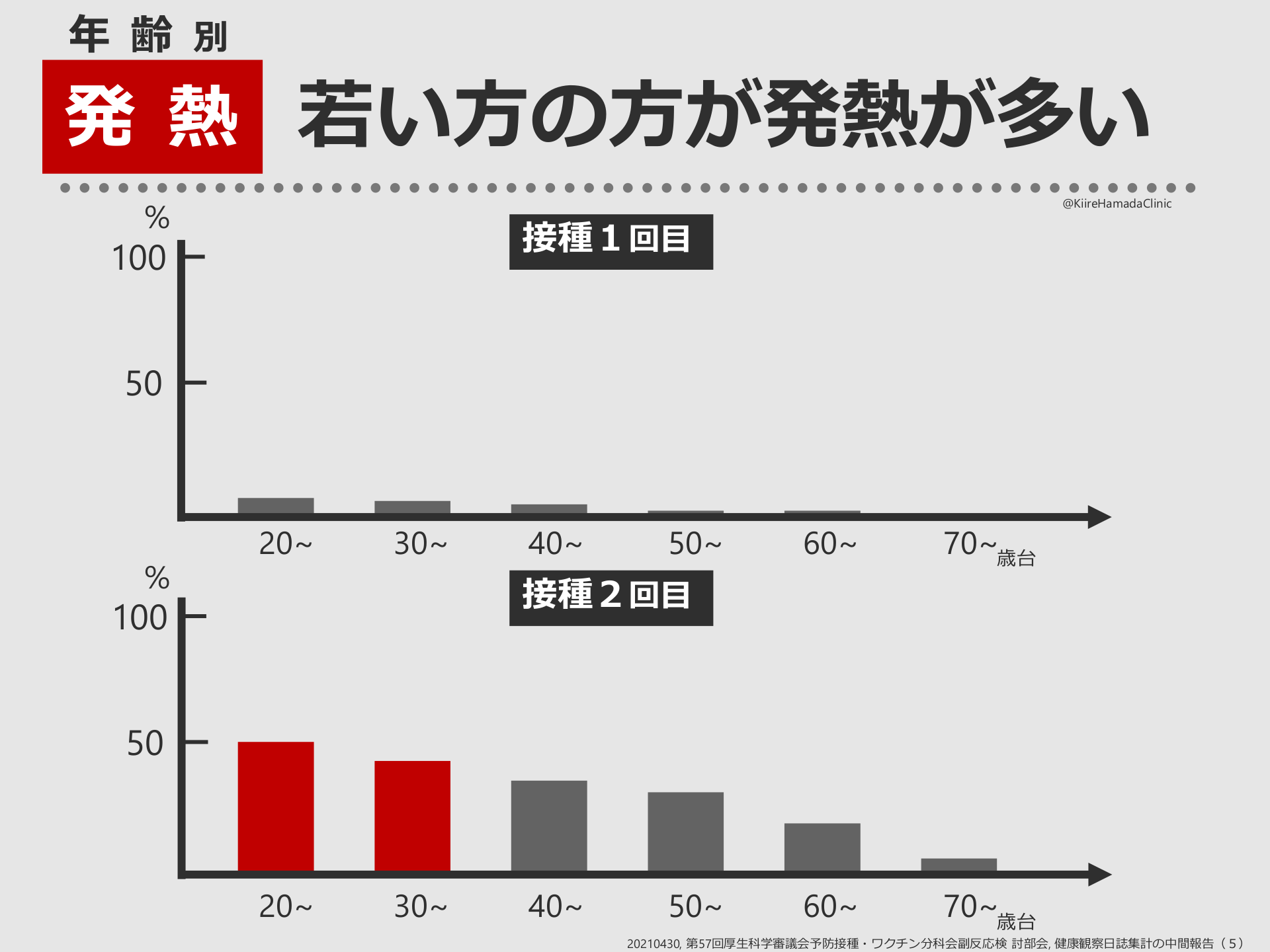 #37. 年 齢 別 発 熱 若い方の方が発熱が多い % @KiireHamadaClinic 接種1回目 100 50 % 20~ 30~ 40~ 50~ 60~ 70~歳台 60~ 70~歳台 接種2回目 100 50 20~ 30~ 40~ 50~ 20210430, 第57回厚生科学審議会予防接種・ワクチン分科会副反応検 討部会, 健康観察日誌集計の中間報告(5)