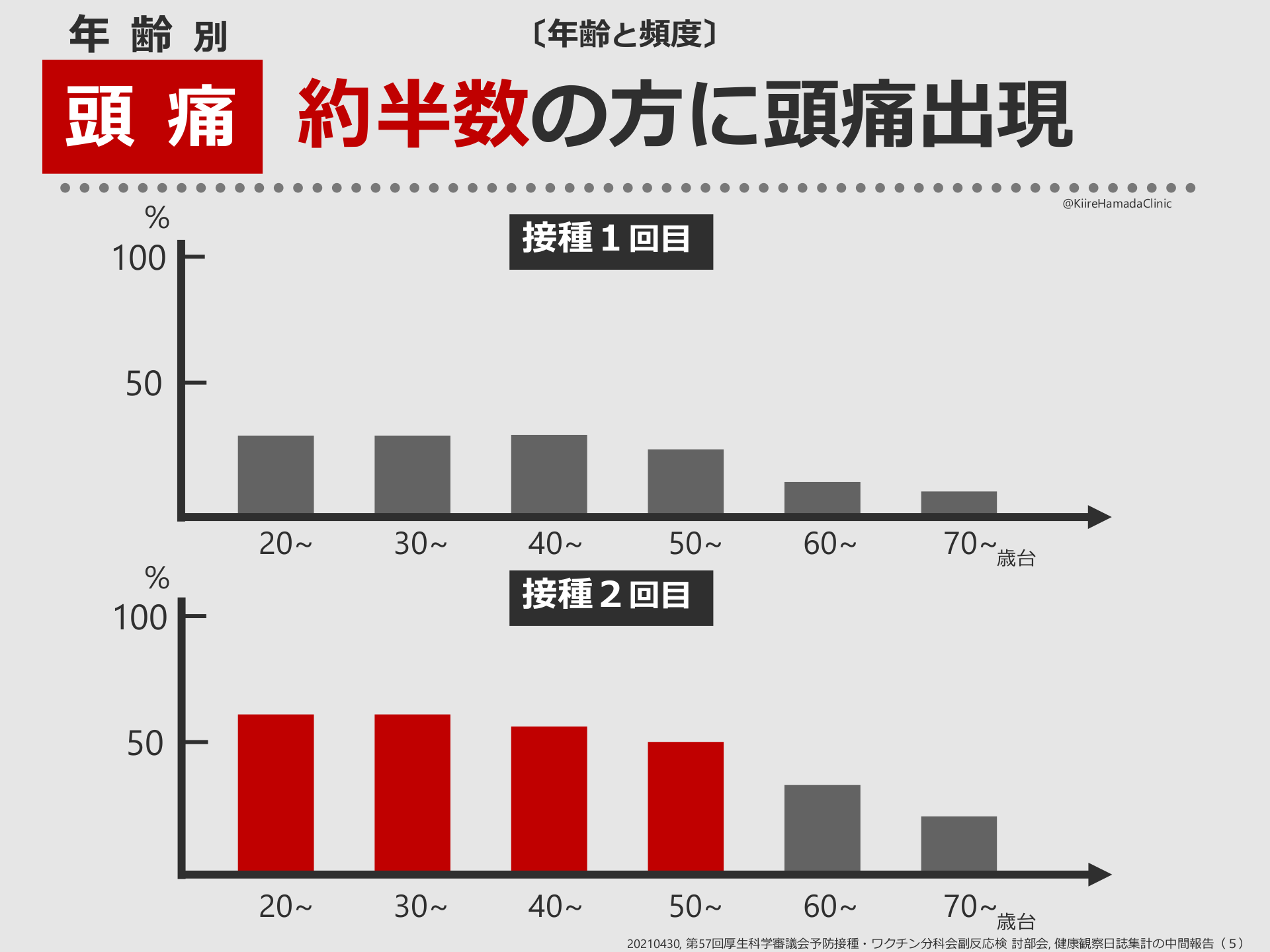 #38. 年 齢 別 〔年齢と頻度〕 頭 痛 約半数の方に頭痛出現 % @KiireHamadaClinic 接種1回目 100 50 % 20~ 30~ 40~ 50~ 60~ 70~歳台 60~ 70~歳台 接種2回目 100 50 20~ 30~ 40~ 50~ 20210430, 第57回厚生科学審議会予防接種・ワクチン分科会副反応検 討部会, 健康観察日誌集計の中間報告(5)