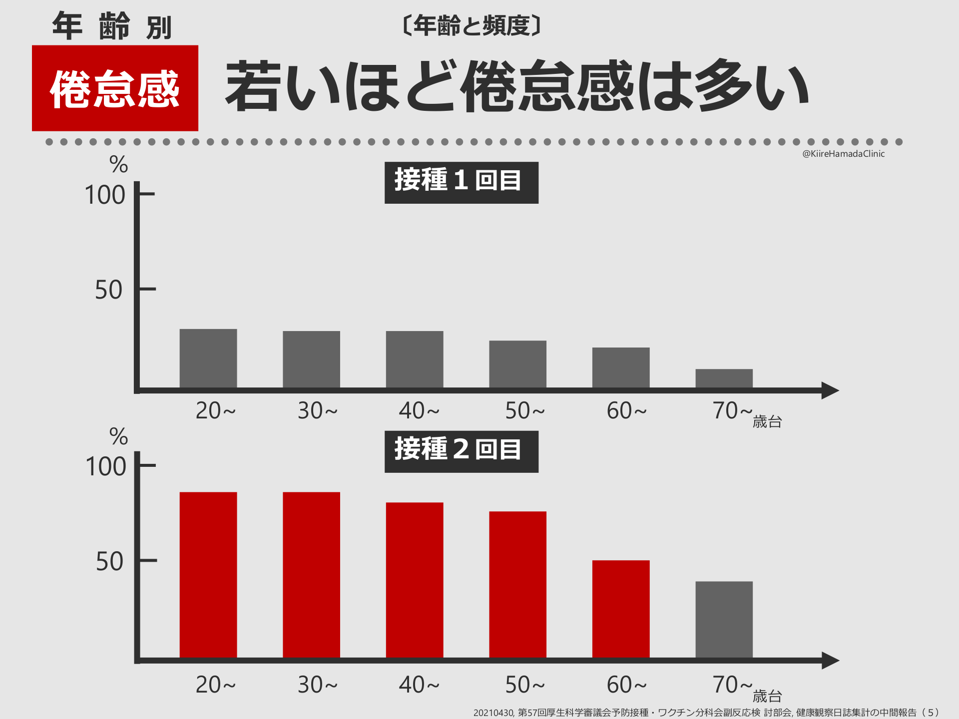 #39. 年 齢 別 倦怠感 〔年齢と頻度〕 若いほど倦怠感は多い % @KiireHamadaClinic 接種1回目 100 50 % 20~ 30~ 40~ 50~ 60~ 70~歳台 60~ 70~歳台 接種2回目 100 50 20~ 30~ 40~ 50~ 20210430, 第57回厚生科学審議会予防接種・ワクチン分科会副反応検 討部会, 健康観察日誌集計の中間報告(5)