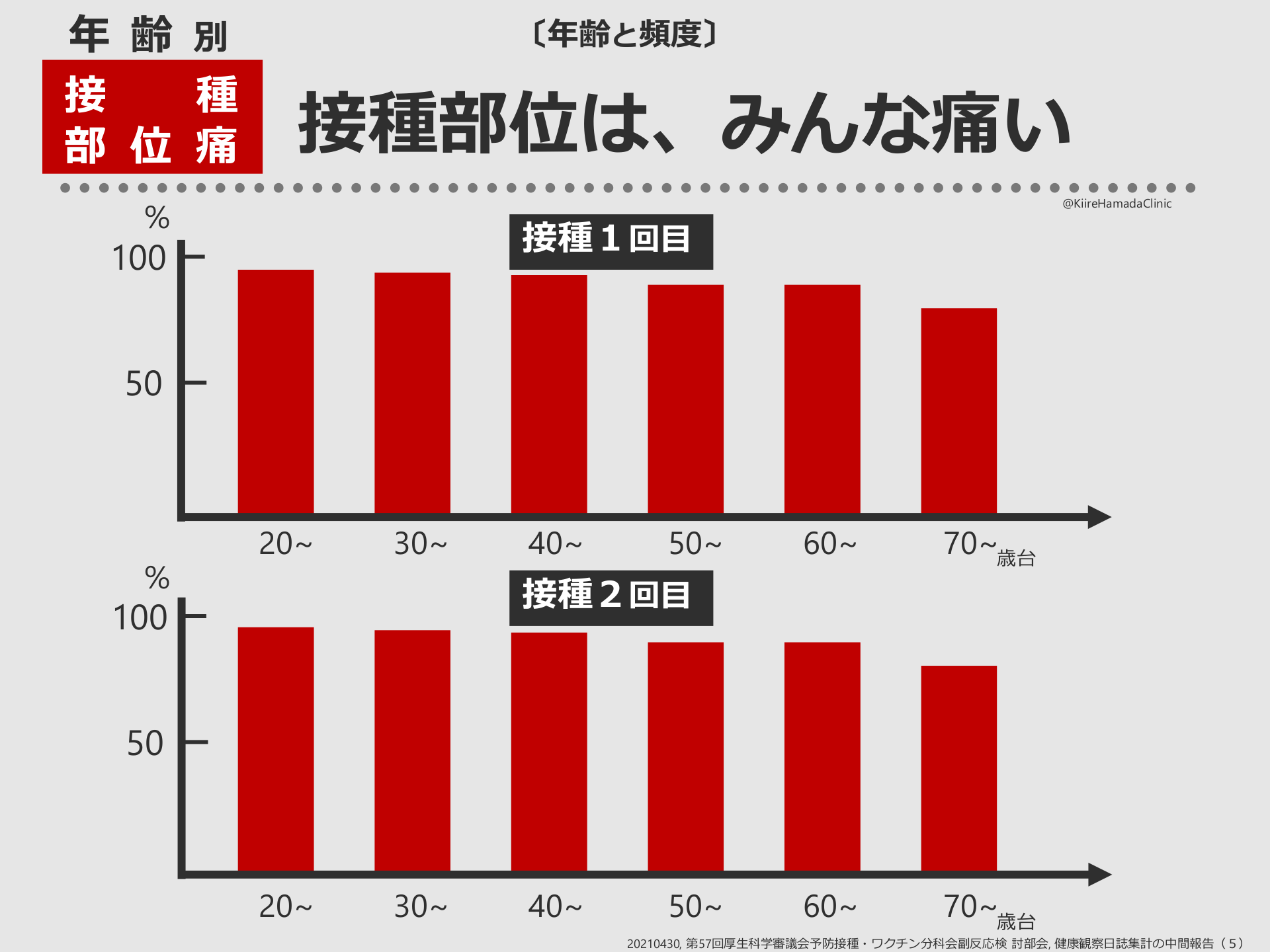 #40. 年 齢 別 接 種 部 位 痛 〔年齢と頻度〕 接種部位は、みんな痛い % @KiireHamadaClinic 接種1回目 100 50 % 20~ 30~ 40~ 50~ 60~ 70~歳台 60~ 70~歳台 接種2回目 100 50 20~ 30~ 40~ 50~ 20210430, 第57回厚生科学審議会予防接種・ワクチン分科会副反応検 討部会, 健康観察日誌集計の中間報告(5)