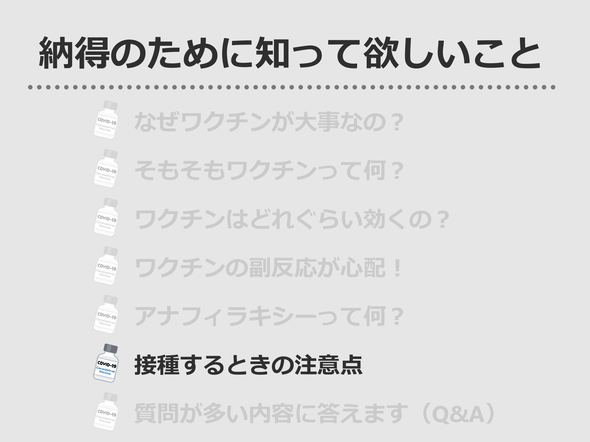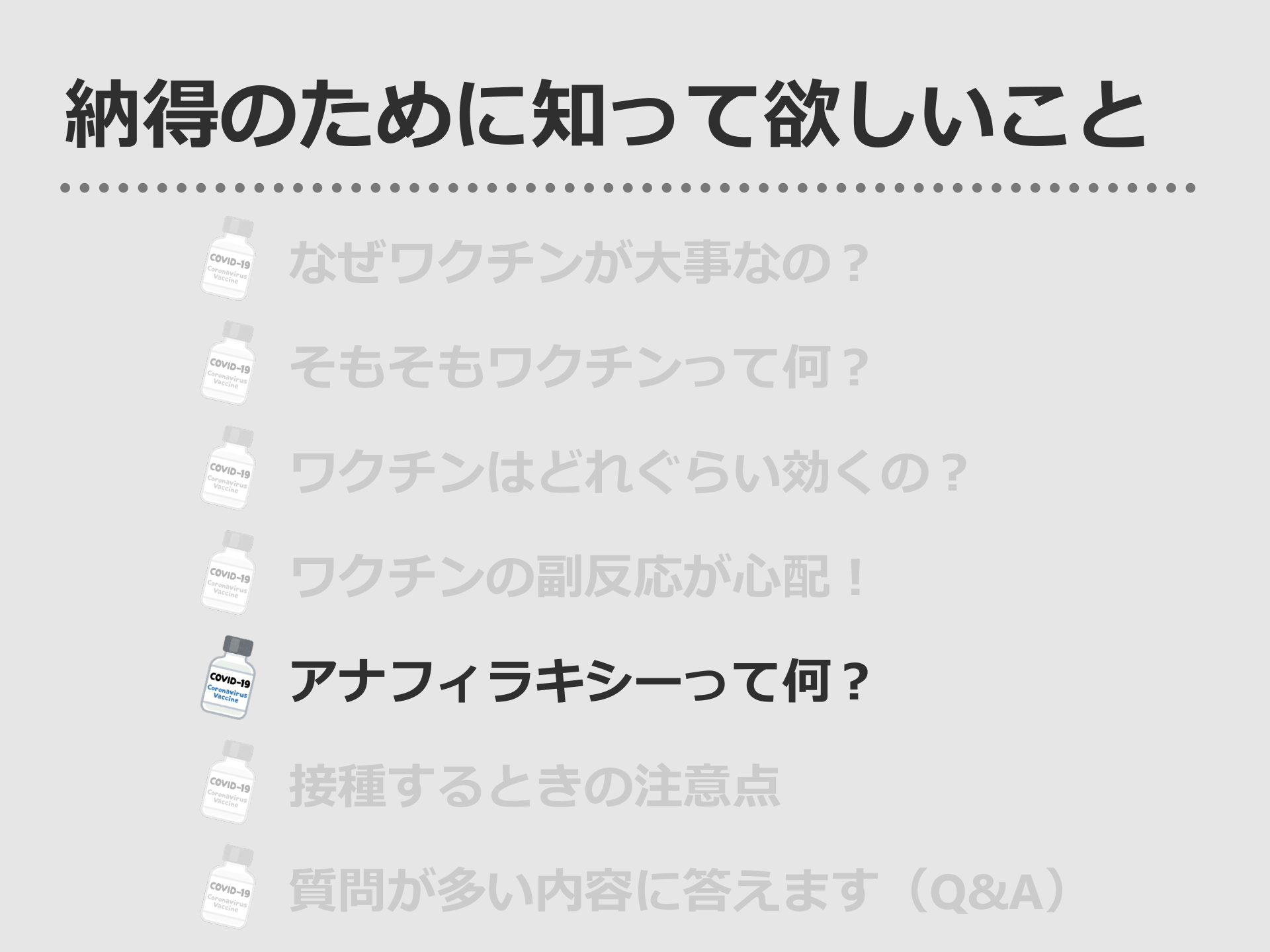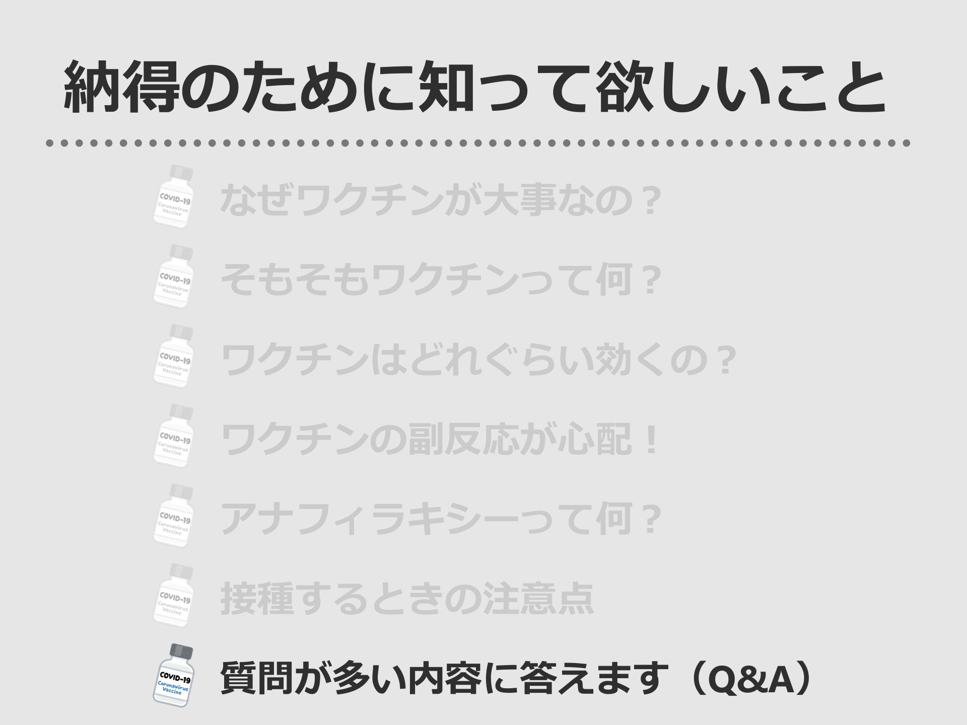 #11. 納得のために知って欲しいこと なぜワクチンが大事なの? そもそもワクチンって何? ワクチンはどれぐらい効くの? ワクチンの副反応が心配! アナフィラキシーって何? 接種するときの注意点 質問が多い内容に答えます(Q&A)