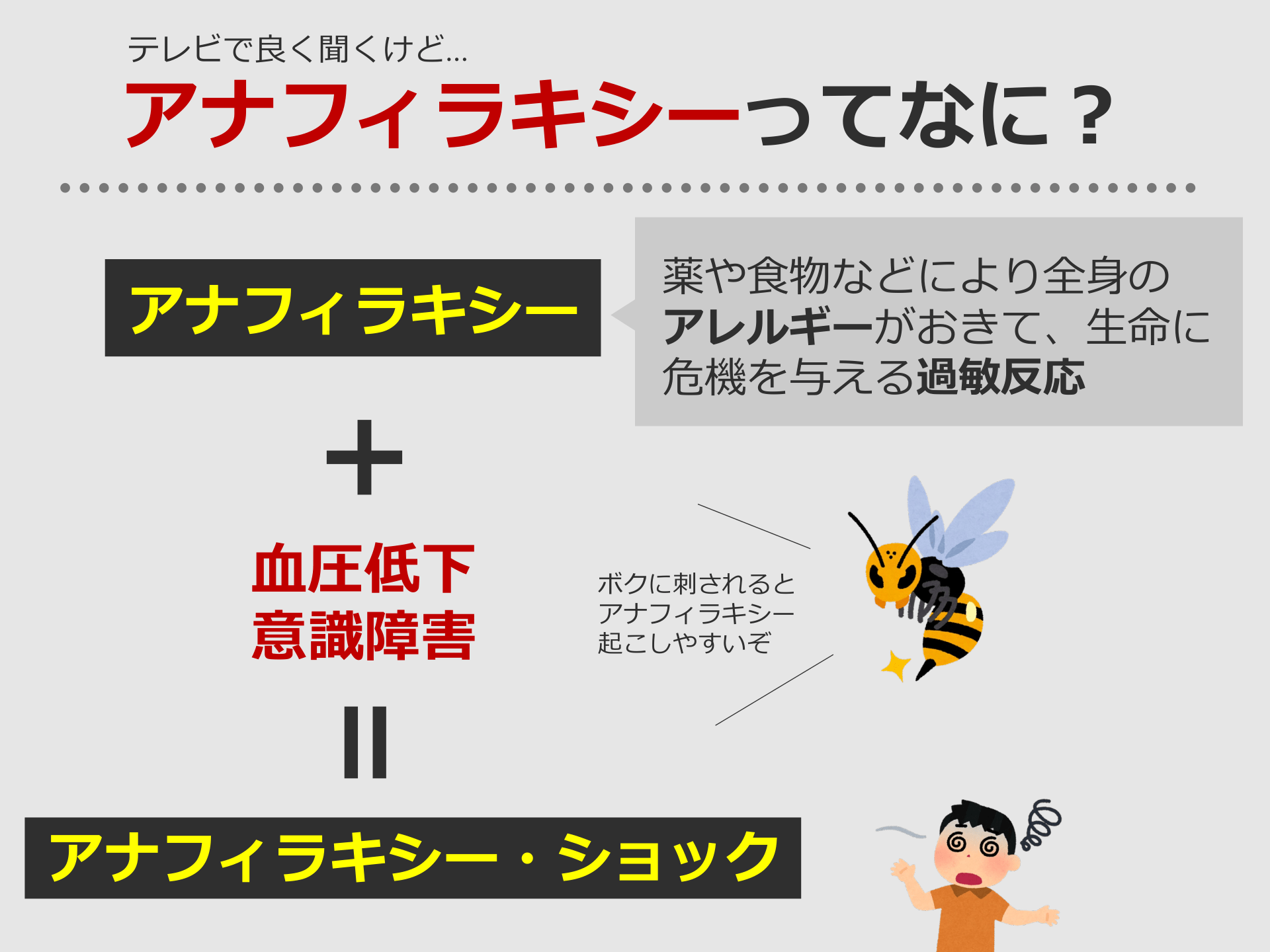 #42. テレビで良く聞くけど… アナフィラキシーってなに? アナフィラキシー + 血圧低下 意識障害 薬や食物などにより全身の アレルギーがおきて、生命に 危機を与える過敏反応 ボクに刺されると アナフィラキシー 起こしやすいぞ = アナフィラキシー・ショック