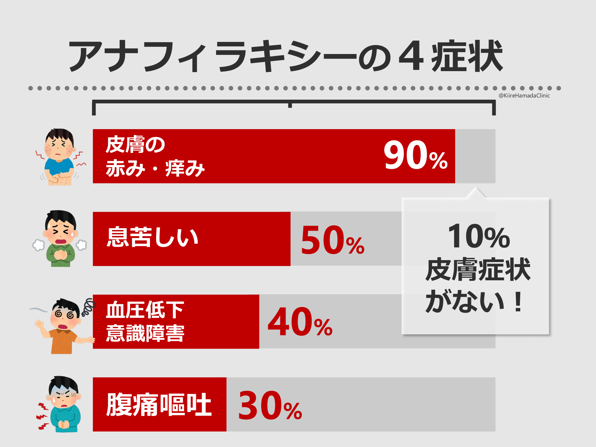 #43. アナフィラキシーの4症状 @KiireHamadaClinic 90% 皮膚の 赤み・痒み 息苦しい 血圧低下 意識障害 腹痛嘔吐 50% 40% 30% 10% 皮膚症状 がない!