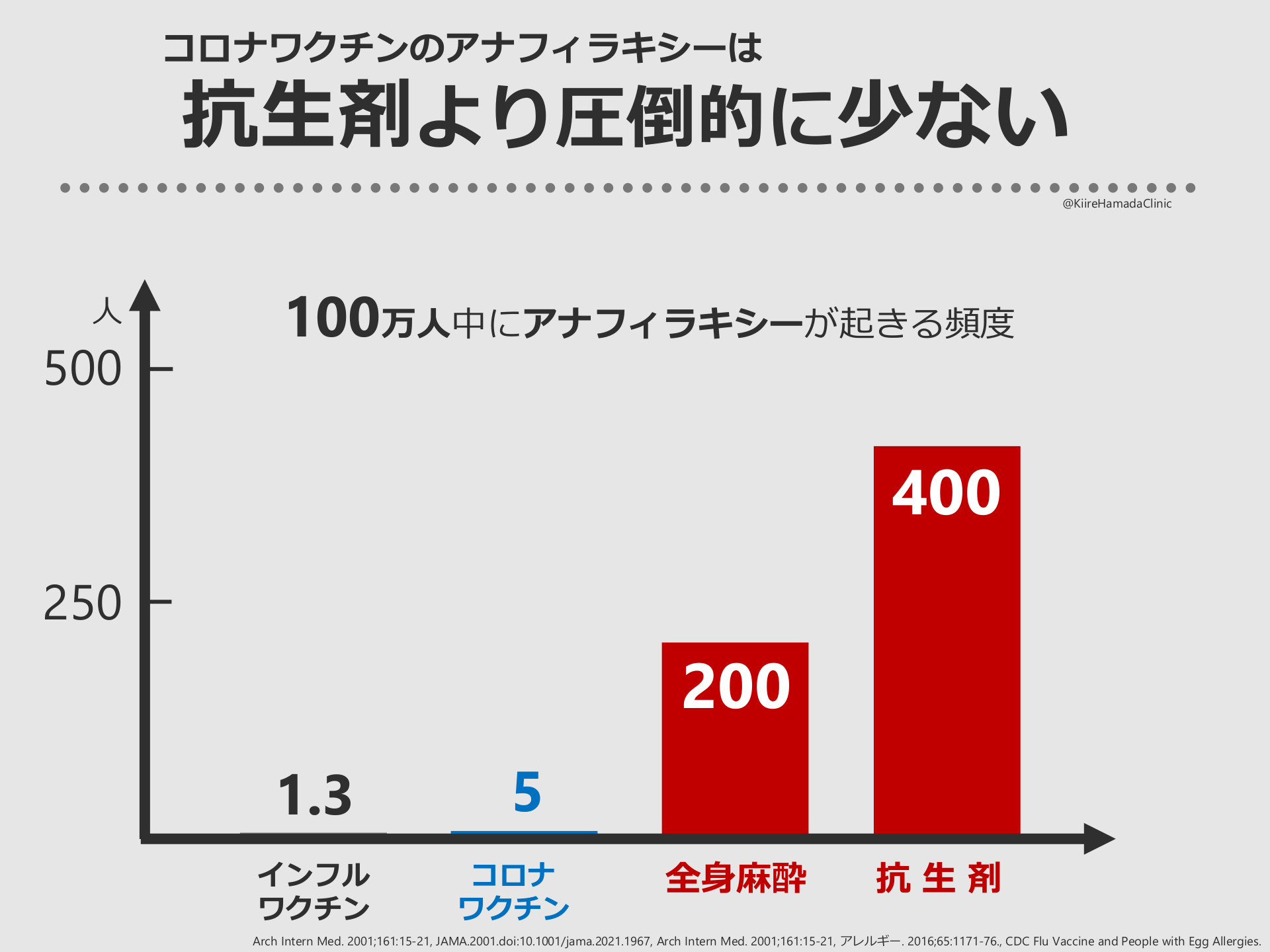 #44. コロナワクチンのアナフィラキシーは 抗生剤より圧倒的に少ない @KiireHamadaClinic 人 500 100万人中にアナフィラキシーが起きる頻度 400 250 200 1.3 インフル ワクチン 5 コロナ ワクチン 全身麻酔 抗生剤 Arch Intern Med. 2001;161:15-21, JAMA.2001.doi:10.1001/jama.2021.1967, Arch Intern Med. 2001;161:15-21, アレルギー. 2016;65:1171-76., CDC Flu Vaccine and People with Egg Allergies.