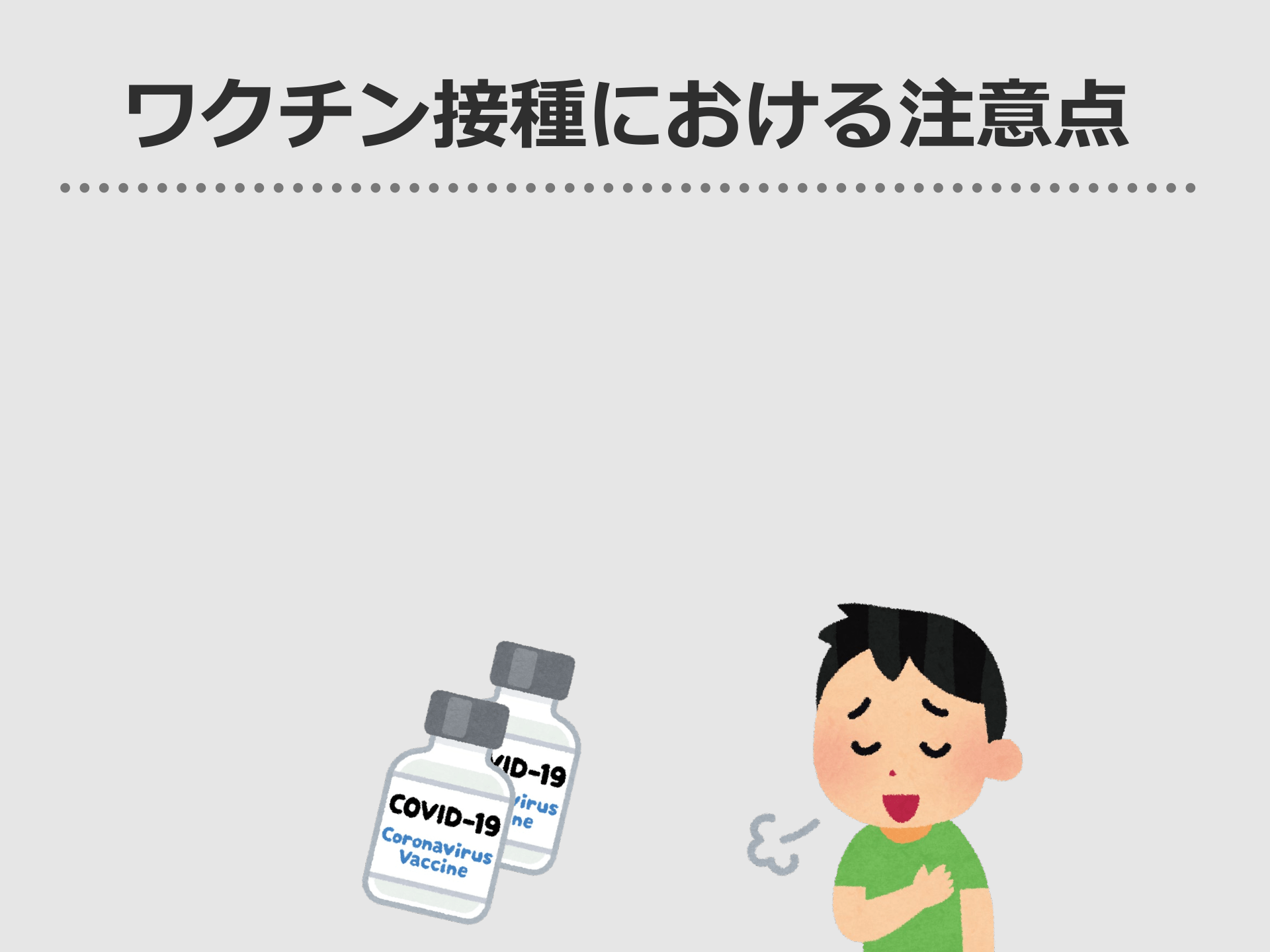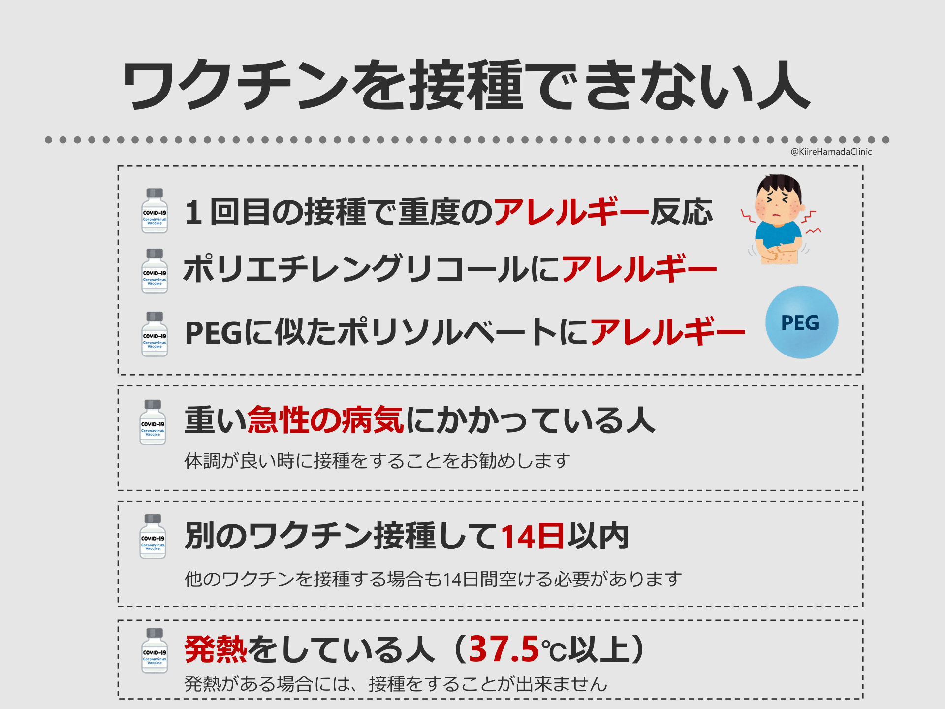 #48. ワクチンを接種できない人 @KiireHamadaClinic 1回目の接種で重度のアレルギー反応 ポリエチレングリコールにアレルギー PEGに似たポリソルベートにアレルギー 重い急性の病気にかかっている人 体調が良い時に接種をすることをお勧めします 別のワクチン接種して14日以内 他のワクチンを接種する場合も14日間空ける必要があります 発熱をしている人(37.5℃以上) 発熱がある場合には、接種をすることが出来ません PEG