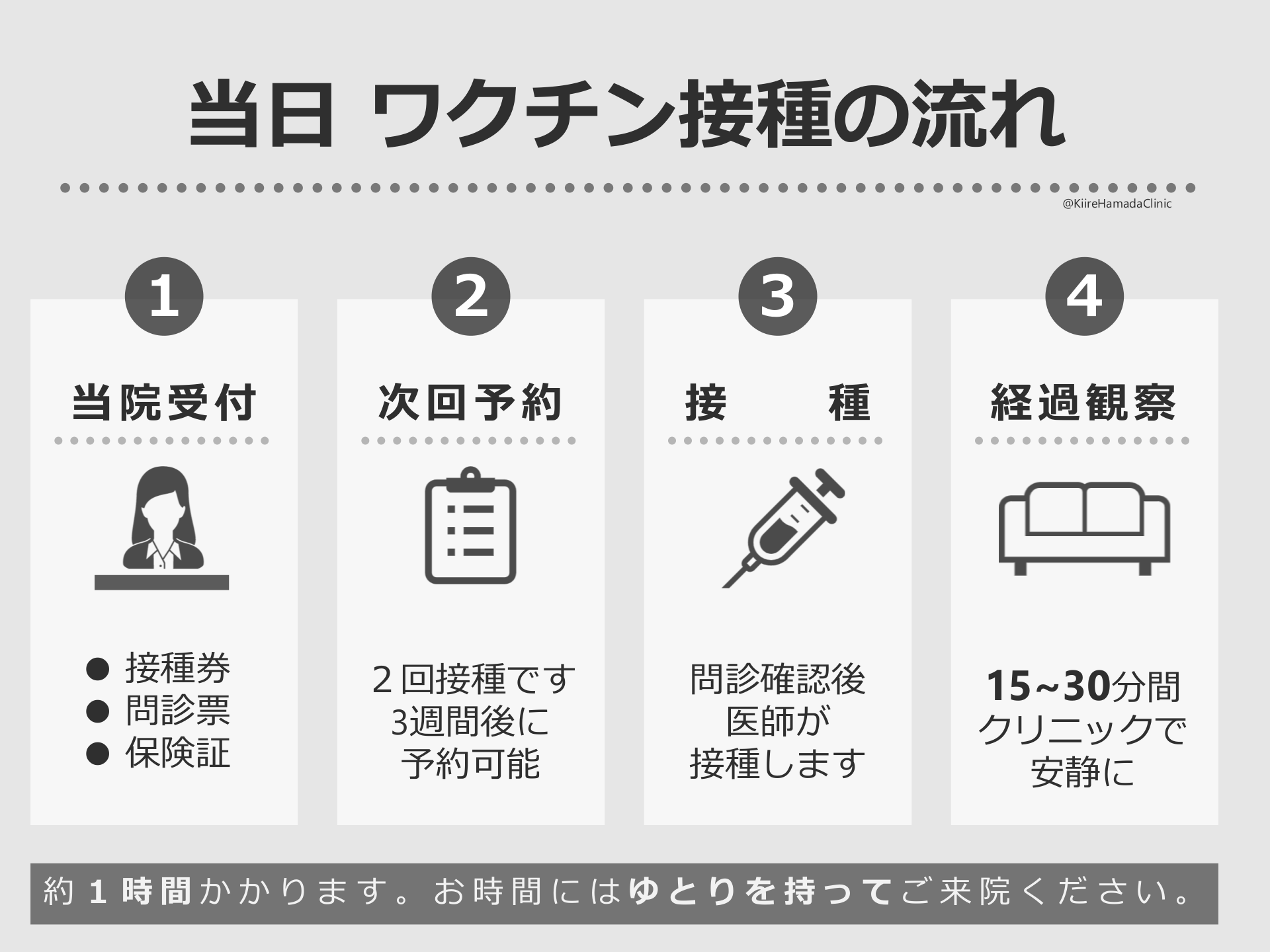 #47. 当日 ワクチン接種の流れ @KiireHamadaClinic 1 2 当院受付 次回予約 ● 接種券 ● 問診票 ● 保険証 2回接種です 3週間後に 予約可能 3 接 4 種 経過観察 問診確認後 医師が 接種します 15~30分間 クリニックで 安静に 約1時間かかります。お時間にはゆとりを持ってご来院ください。