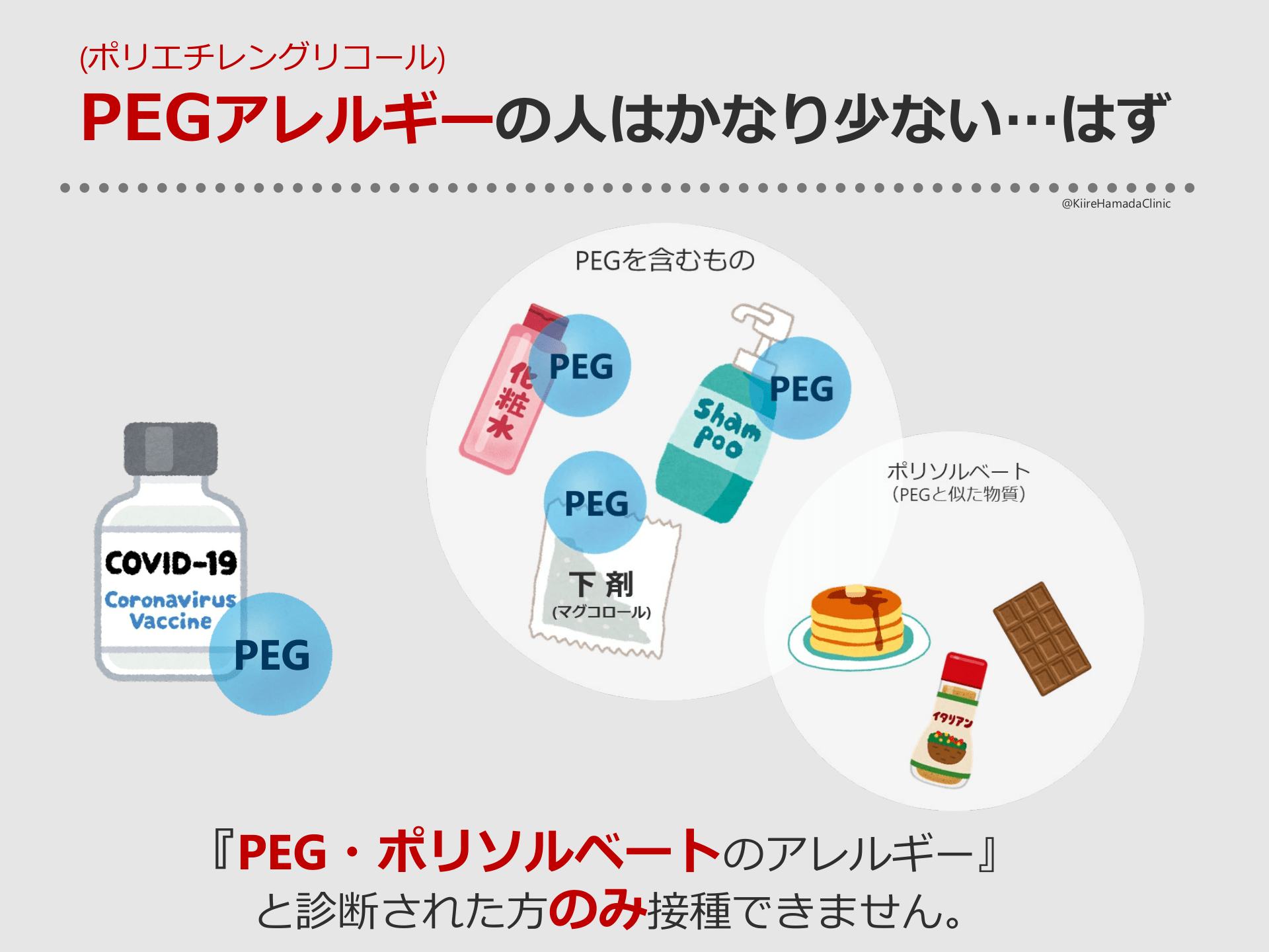 #49. (ポリエチレングリコール) PEGアレルギーの人はかなり少ない…はず @KiireHamadaClinic PEG 『PEG・ポリソルベートのアレルギー』 と診断された方のみ接種できません。