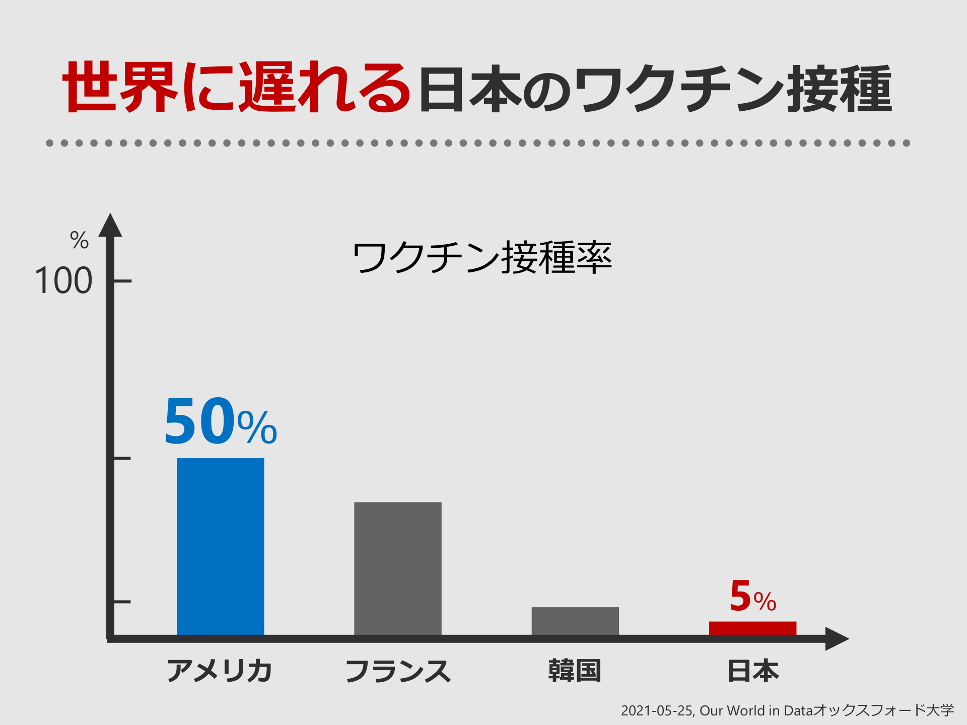 #5. 世界に遅れる日本のワクチン接種 % ワクチン接種率 100 50% 5% アメリカ フランス 韓国 日本 2021-05-25, Our World in Dataオックスフォード大学