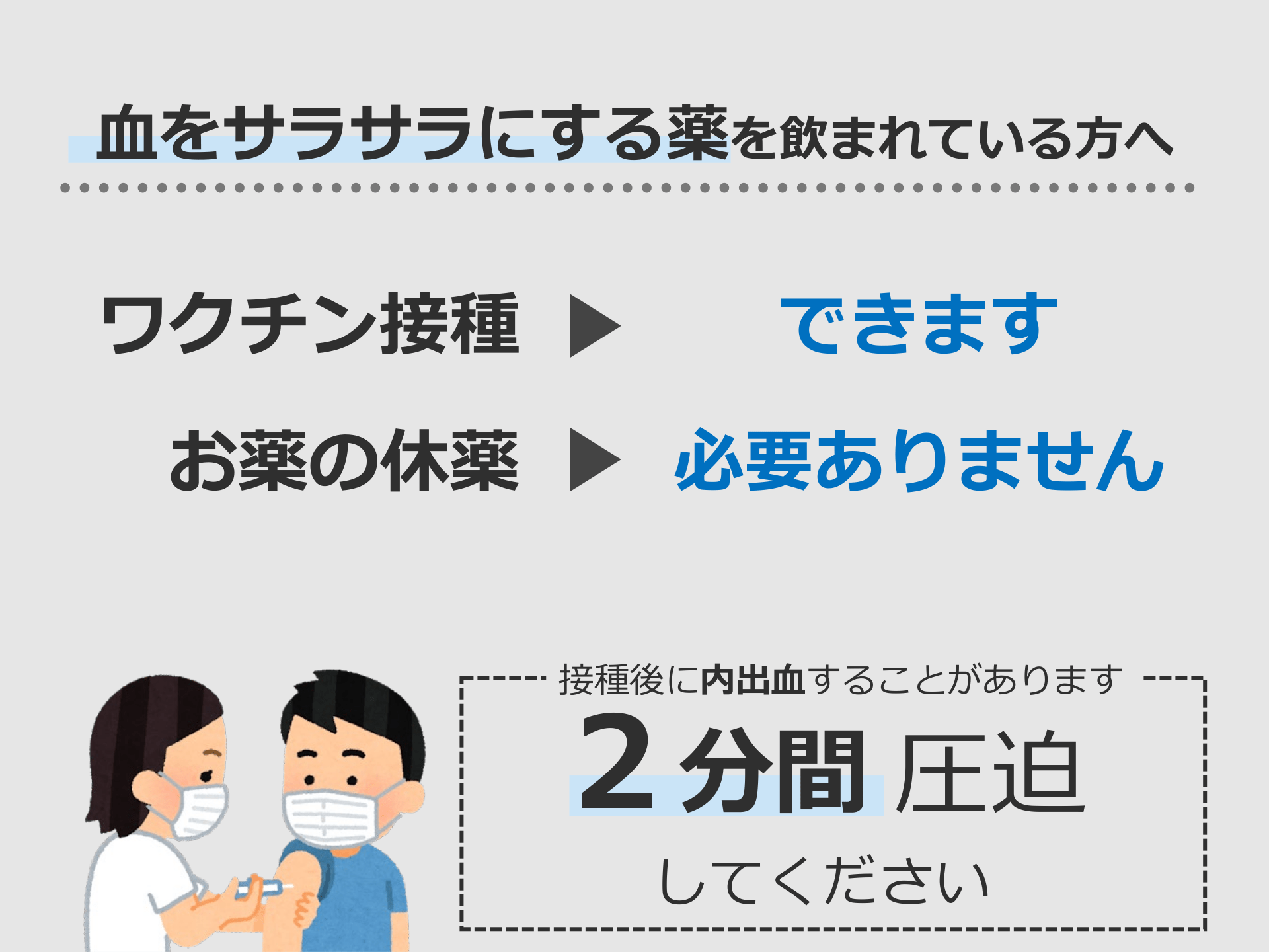 #50. 血をサラサラにする薬を飲まれている方へ ワクチン接種 お薬の休薬 できます 必要ありません 接種後に内出血することがあります 2分間 圧迫 してください