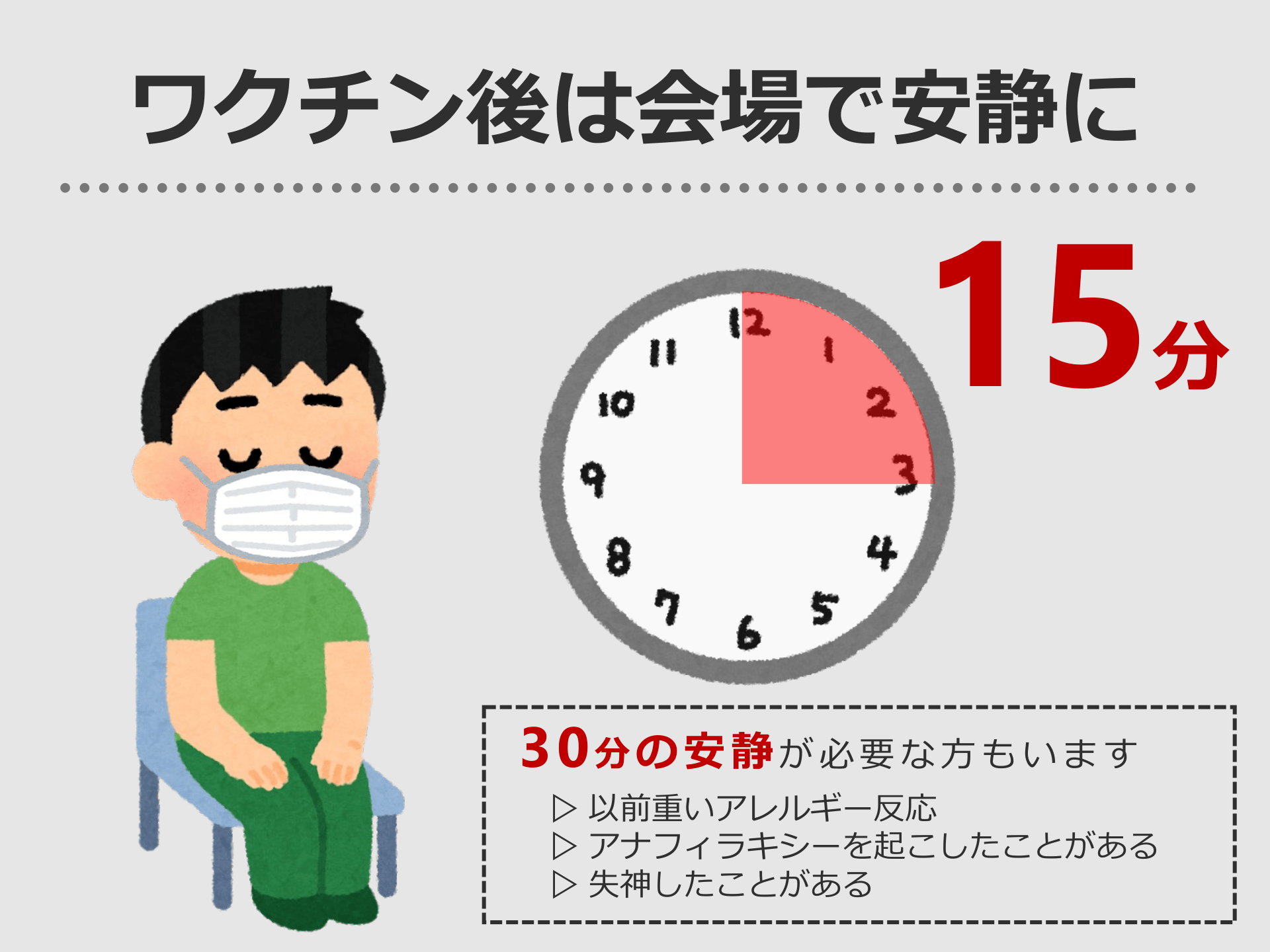 #52. ワクチン後は会場で安静に 15 30 分 の 安 静 が 必 要 な 方 も い ま す 分 ▷ 以前重いアレルギー反応 ▷ アナフィラキシーを起こしたことがある ▷ 失神したことがある