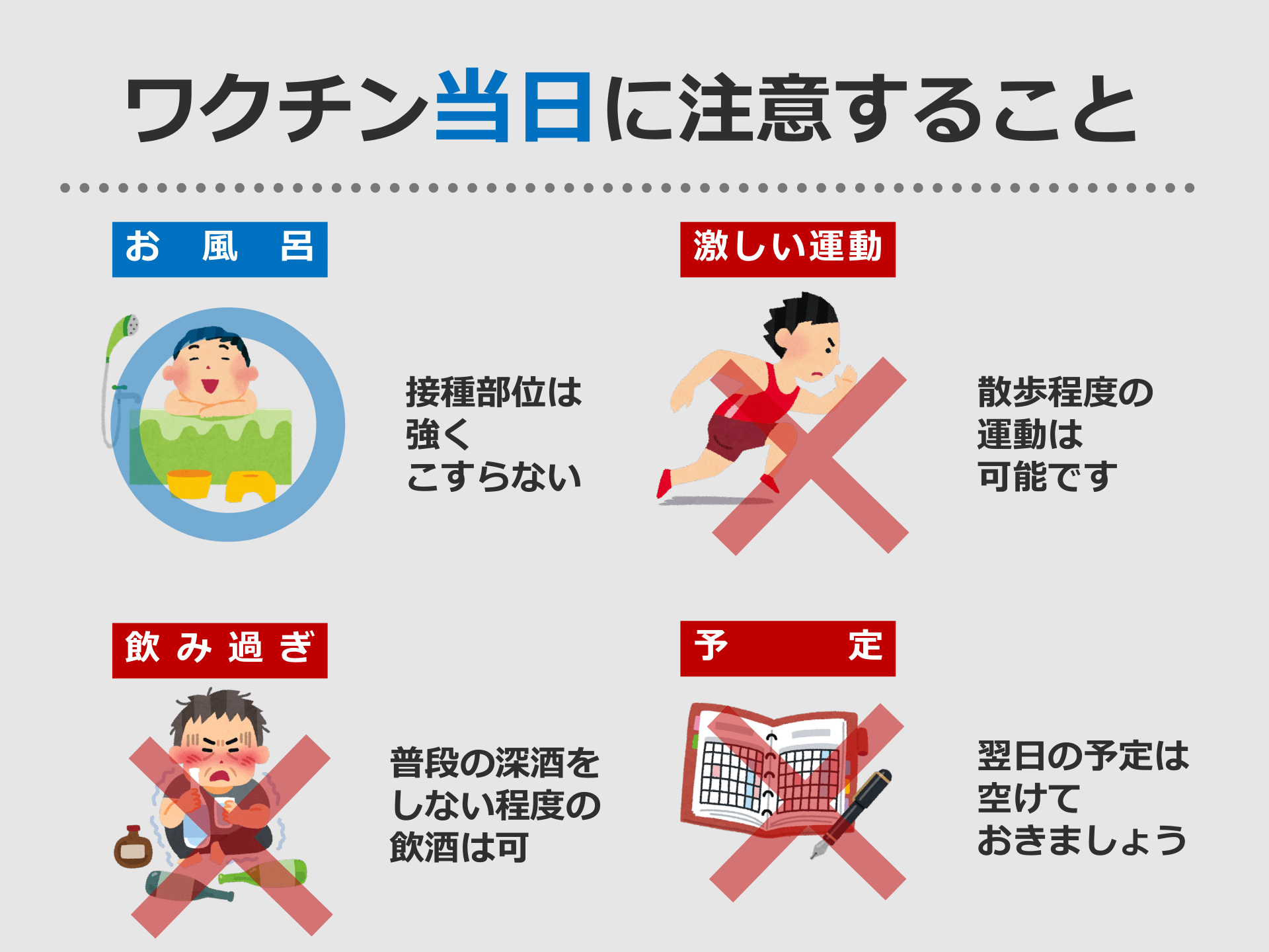 #53. ワクチン当日に注意すること お 風 呂 激しい運動 散歩程度の 運動は 可能です 接種部位は 強く こすらない 予 飲 み 過 ぎ 普段の深酒を しない程度の 飲酒は可 定 翌日の予定は 空けて おきましょう