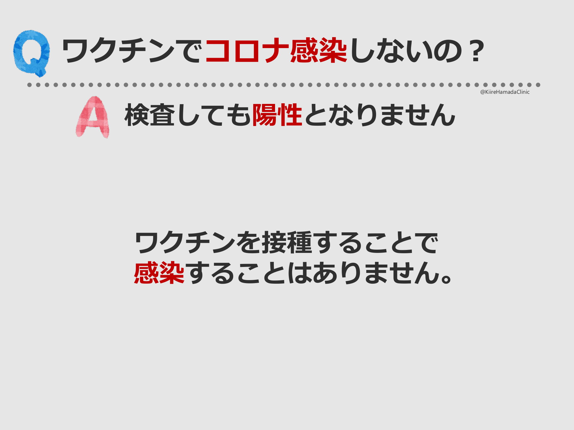 #58. ワクチンでコロナ感染しないの? @KiireHamadaClinic 検査しても陽性となりません ワクチンを接種することで 感染することはありません。