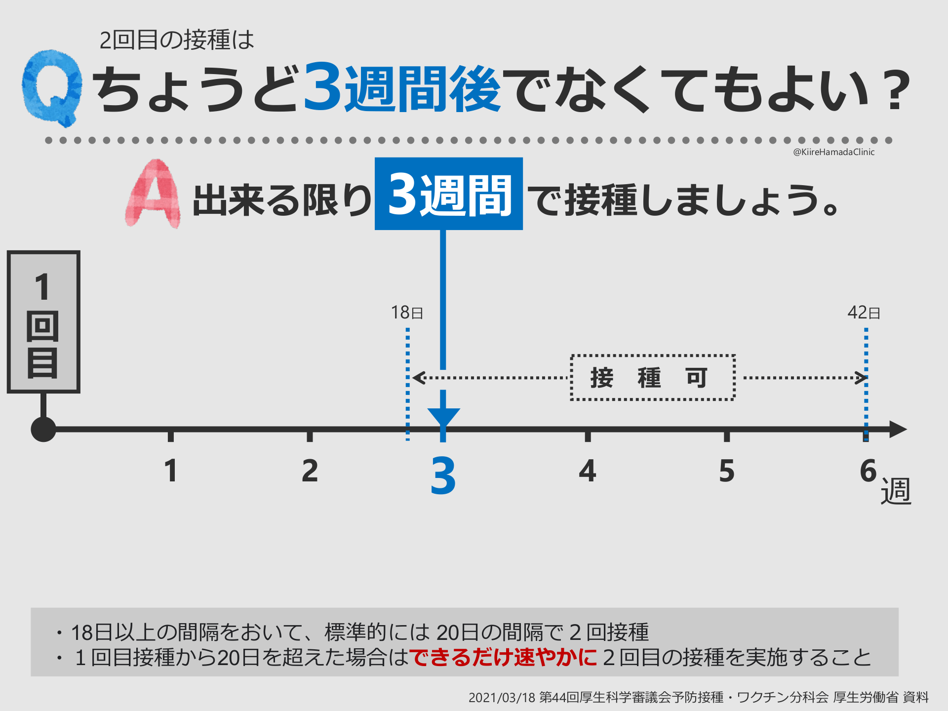 #59. 2回目の接種は ちょうど3週間後でなくてもよい? 出来る限り 3週間 で接種しましょう。 @KiireHamadaClinic 回目 1 42日 18日 接 1 2 3 4 種 可 5 6 週 ・18日以上の間隔をおいて、標準的には 20日の間隔で2回接種 ・1回目接種から20日を超えた場合はできるだけ速やかに2回目の接種を実施すること 2021/03/18 第44回厚生科学審議会予防接種・ワクチン分科会 厚生労働省 資料