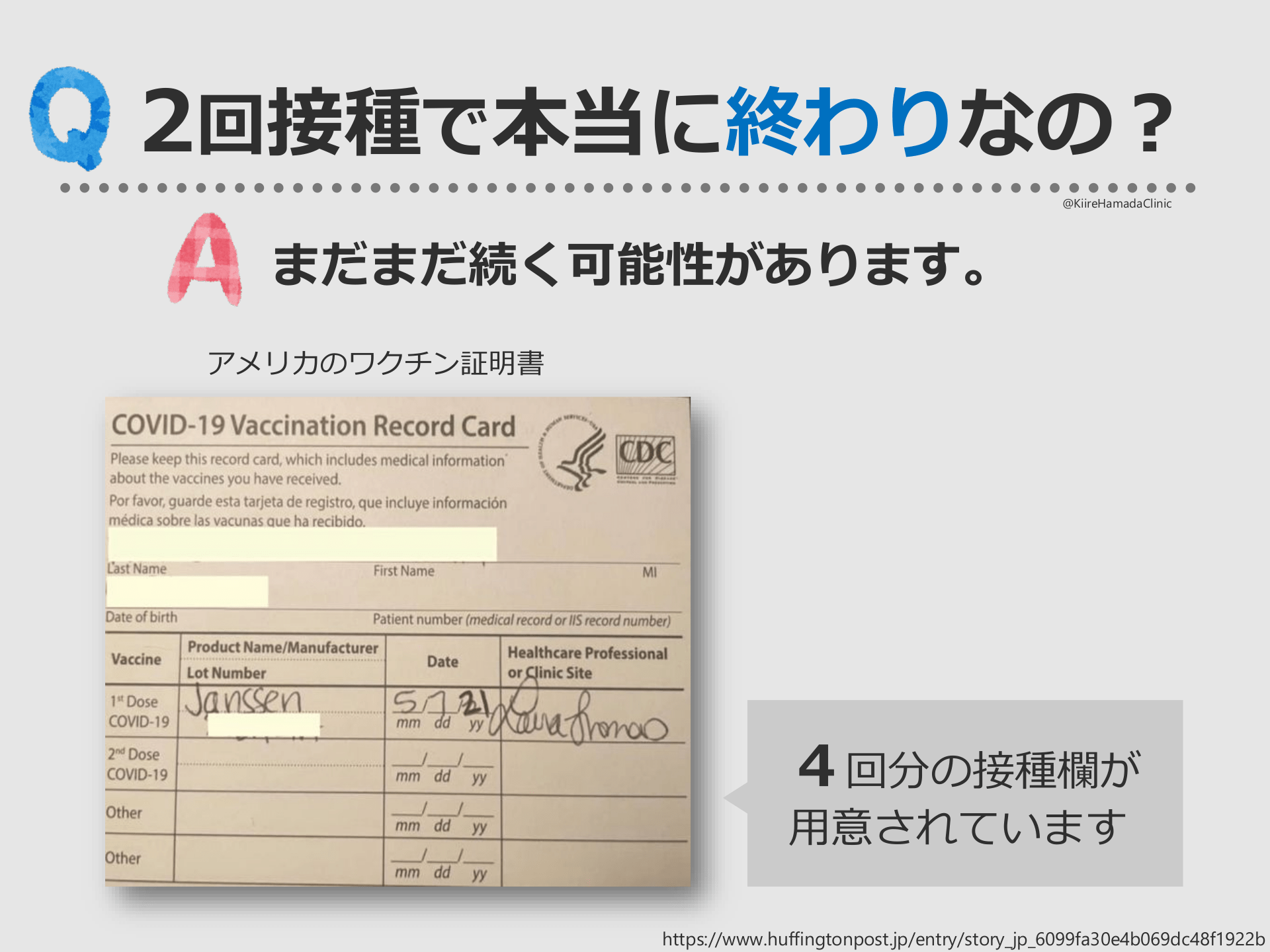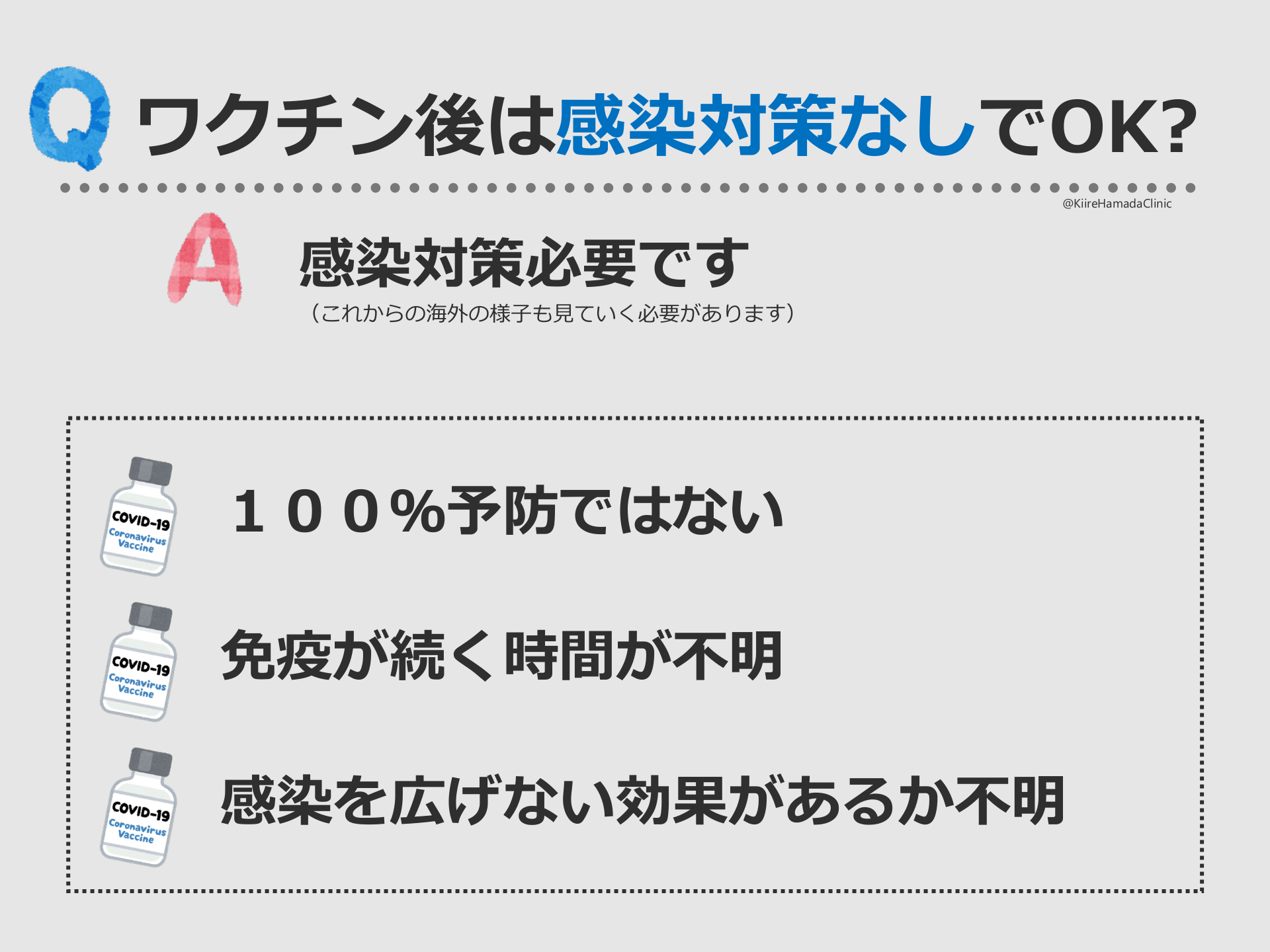 #60. ワクチン後は感染対策なしでOK? @KiireHamadaClinic 感染対策必要です (これからの海外の様子も見ていく必要があります) 100%予防ではない 免疫が続く時間が不明 感染を広げない効果があるか不明