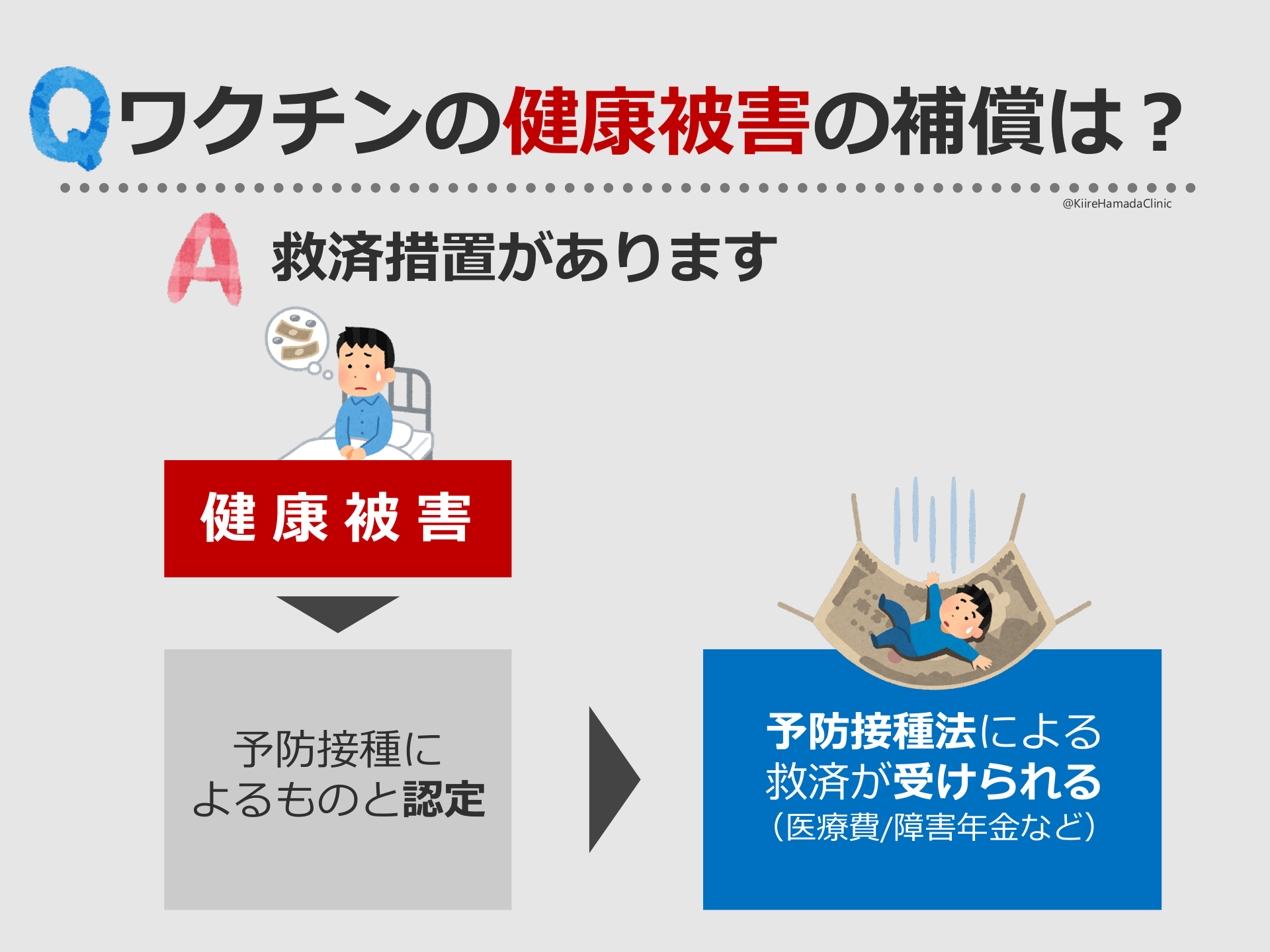 #61. ワクチンの健康被害の補償は? @KiireHamadaClinic 救済措置があります 健康被害 予防接種に よるものと認定 予防接種法による 救済が受けられる (医療費/障害年金など)