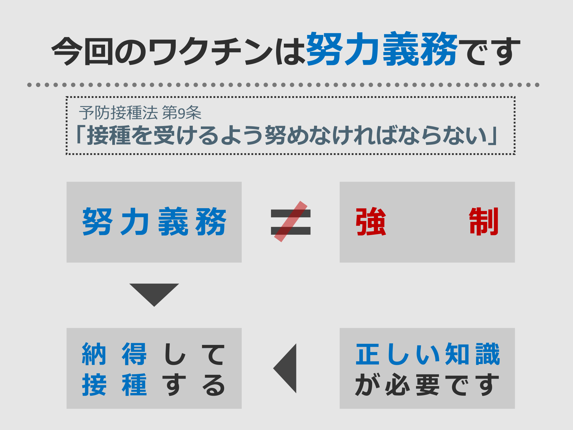 #64. 今回のワクチンは努力義務です 予防接種法 第9条 「接種を受けるよう努めなければならない」 努力義務 強 制 納 得 し て 接 種 す る 正しい知識 が必要です