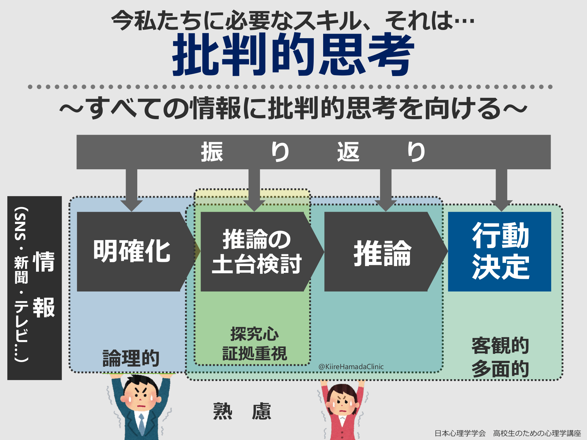 #69. 今私たちに必要なスキル、それは… 批判的思考 ~すべての情報に批判的思考を向ける~ 振 り 返 り ( 情 報 ・新聞・テレビ ) SNS … 明確化 論理的 推論の 土台検討 探究心 証拠重視 熟 推論 @KiireHamadaClinic 行動 決定 客観的 多面的 慮 日本心理学学会 高校生のための心理学講座