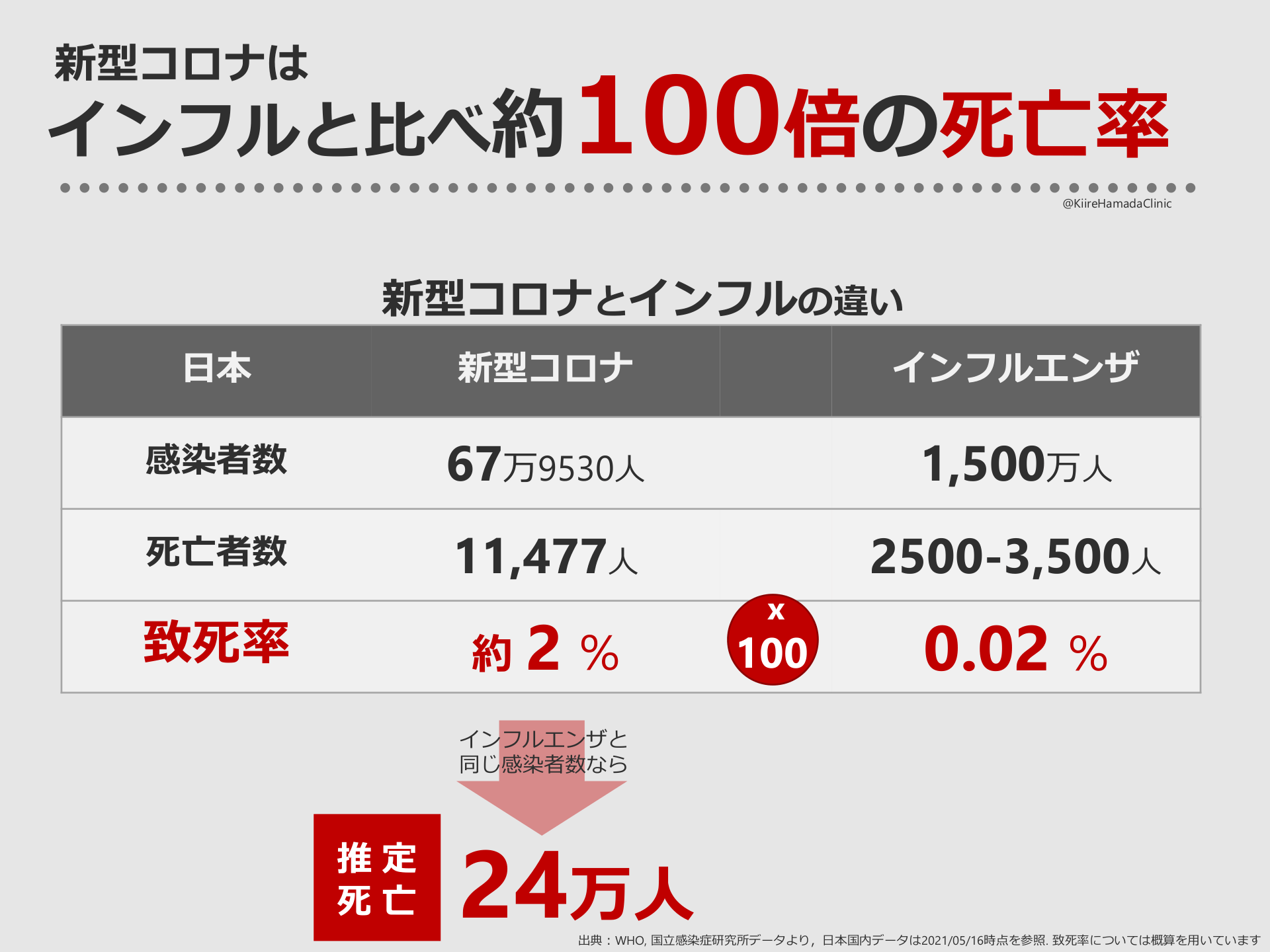 #7. 新型コロナは 100倍の死亡率 インフルと比べ約 @KiireHamadaClinic 新型コロナとインフルの違い 日本 新型コロナ インフルエンザ 感染者数 67万9530人 1,500万人 死亡者数 11,477人 2500-3,500人 約2 % 致死率 x 100 0.02 % インフルエンザと 同じ感染者数なら 推定 死亡 24万人 出典:WHO, 国立感染症研究所データより,日本国内データは2021/05/16時点を参照. 致死率については概算を用いています