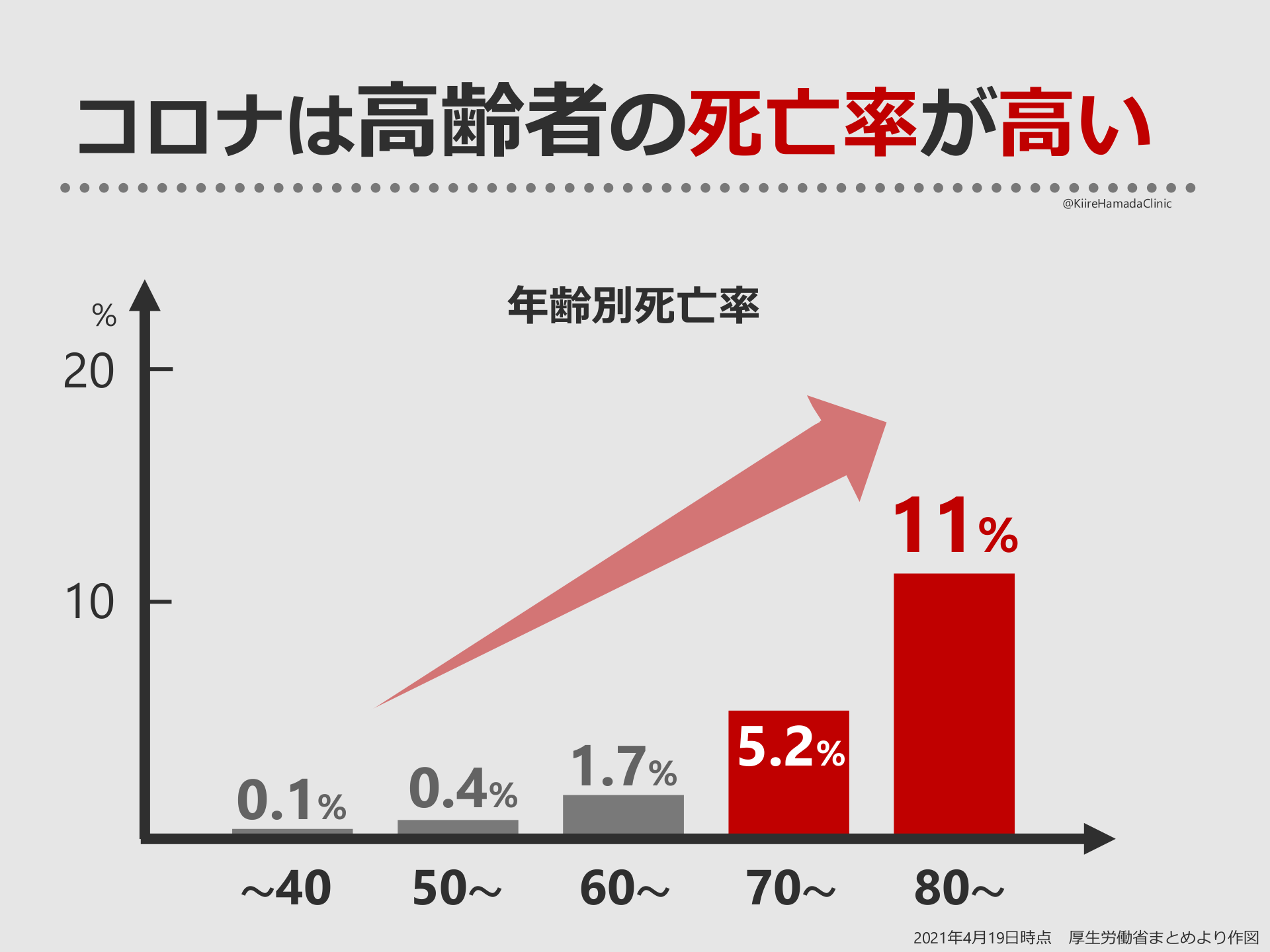 #8. コロナは高齢者の死亡率が高い @KiireHamadaClinic 年齢別死亡率 % 20 11% 10 0.1% 〜40 0.4% 1.7% 5.2% 50〜 60〜 70〜 80〜 2021年4月19日時点 厚生労働省まとめより作図