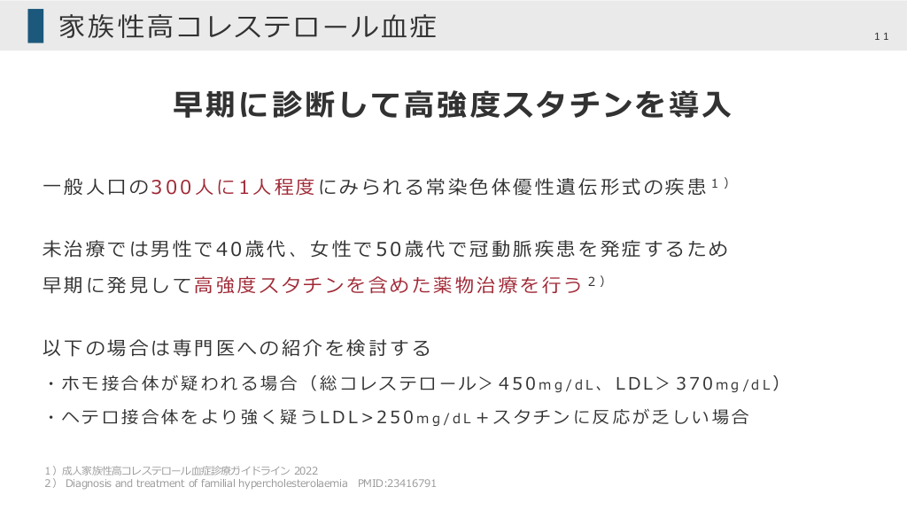 家族性⾼コレステロール⾎症 早期に診断して⾼強度スタチンを導⼊ ⼀般⼈⼝の300⼈に1⼈程度にみられる常染⾊体優性遺伝形式の疾患1) 未治療では男性で40歳代、⼥性で50歳代で冠動脈疾患を発症するため 早期に発⾒して⾼強度スタチンを含めた薬物治療を⾏う2) 以下の場合は専⾨医への紹介を検討する ・ホモ接合体が疑われる場合(総コレステロール>450mg /dL、LDL>370mg /dL) ・ヘテロ接合体をより強く疑うLDL>250mg /dL+スタチンに反応が乏しい場合 1)成⼈家族性⾼コレステロール⾎症診療ガイドライン 2022 2) Diagnosis and treatment of familial hypercholesterolaemia PMID:23416791 11