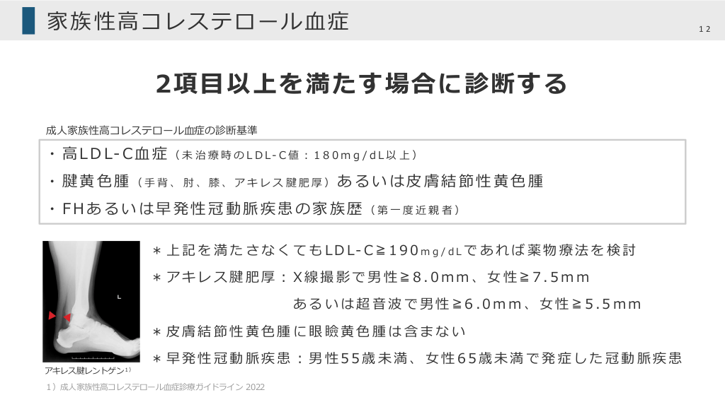 家族性⾼コレステロール⾎症 2項⽬以上を満たす場合に診断する 成⼈家族性⾼コレステロール⾎症の診断基準 ・ ⾼ L D L- C ⾎ 症 ( 未 治 療 時 の L D L - C 値 ︓ 1 8 0 m g / d L 以 上 ) ・腱⻩⾊腫(⼿背、肘、膝、アキレス腱肥厚)あるいは⽪膚結節性⻩⾊腫 ・FHあるいは早発性冠動脈疾患の家族歴(第⼀度近親者) * 上 記 を 満 た さ な く て も L D L- C ≧ 1 9 0 m g / d L で あ れ ば 薬 物 療 法 を 検 討 *アキレス腱肥厚︓X線撮影で男性≧8.0mm、⼥性≧7.5mm あるいは超⾳波で男性≧6.0mm、⼥性≧5.5mm *⽪膚結節性⻩⾊腫に眼瞼⻩⾊腫は含まない アキレス腱レントゲン1) *早発性冠動脈疾患︓男性55歳未満、⼥性65歳未満で発症した冠動脈疾患 1)成⼈家族性⾼コレステロール⾎症診療ガイドライン 2022 12