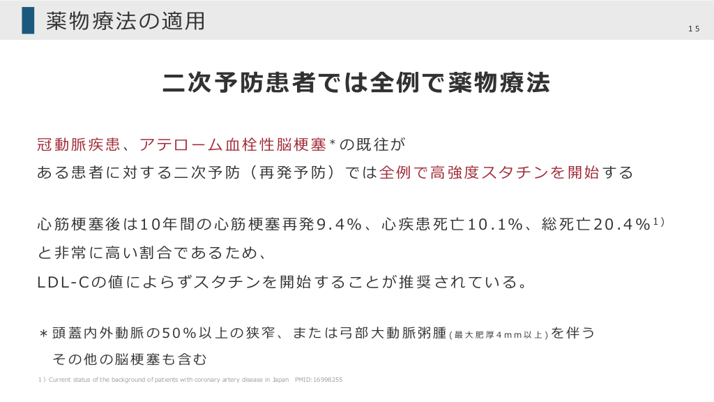 薬物療法の適⽤ 15 ⼆次予防患者では全例で薬物療法 冠動脈疾患、アテローム⾎栓性脳梗塞*の既往が ある患者に対する⼆次予防(再発予防)では全例で⾼強度スタチンを開始する ⼼ 筋 梗 塞 後 は 1 0 年 間 の ⼼ 筋 梗 塞 再 発 9 . 4 % 、 ⼼ 疾 患 死 亡 1 0 . 1% 、 総 死 亡 2 0 . 4 % 1 ) と⾮常に⾼い割合であるため、 L D L- C の 値 に よ ら ず ス タ チ ン を 開 始 す る こ と が 推 奨 さ れ て い る 。 *頭蓋内外動脈の50%以上の狭窄、または⼸部⼤動脈粥腫(最⼤肥厚4mm以上)を伴う その他の脳梗塞も含む 1)Current status of the background of patients with coronary artery disease in Japan PMID:16998255