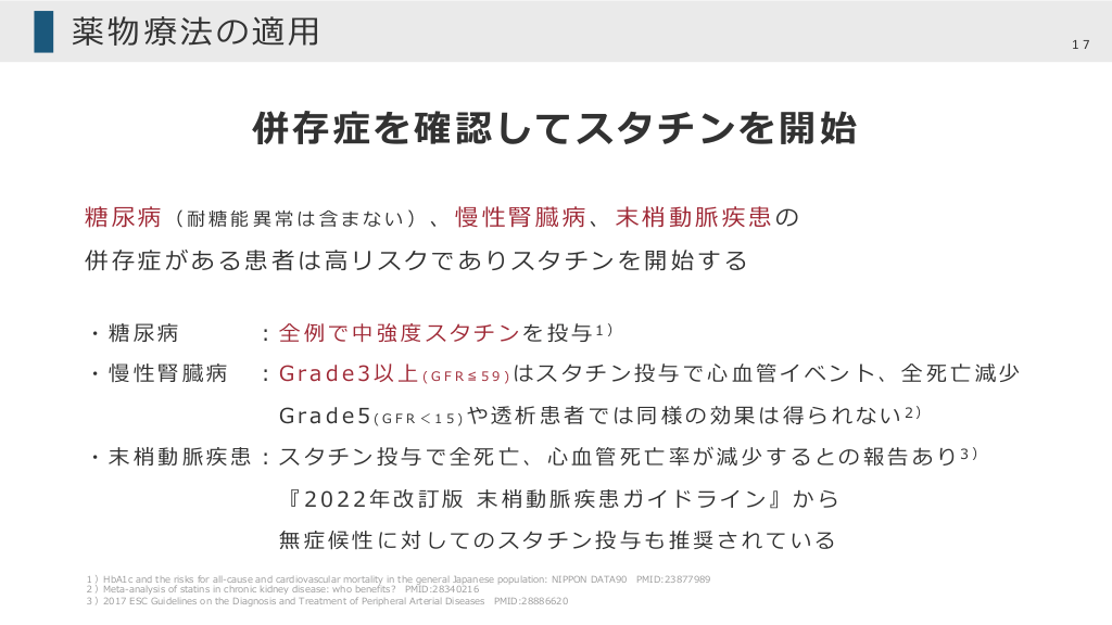 薬物療法の適⽤ 17 併存症を確認してスタチンを開始 糖尿病(耐糖能異常は含まない)、慢性腎臓病、末梢動脈疾患の 併存症がある患者は⾼リスクでありスタチンを開始する ・糖尿病 ︓ 全 例 で 中 強 度 ス タ チ ン を 投 与 1) ・慢性腎臓病 ︓Grade3以上(GFR≦59)はスタチン投与で⼼⾎管イベント、全死亡減少 G r a d e 5 ( G F R < 1 5 ) や 透 析 患 者 で は 同 様 の 効 果 は 得 ら れ な い 2) ・ 末 梢 動 脈 疾 患 ︓ ス タ チ ン 投 与 で 全 死 亡 、 ⼼ ⾎ 管 死 亡 率 が 減 少 す る と の 報 告 あ り 3) 『2022年改訂版 末梢動脈疾患ガイドライン』から 無症候性に対してのスタチン投与も推奨されている 1)HbA1c and the risks for all-cause and cardiovascular mortality in the general Japanese population: NIPPON DATA90 2)Meta-analysis of statins in chronic kidney disease: who benefits? PMID:28340216 3)2017 ESC Guidelines on the Diagnosis and Treatment of Peripheral Arterial Diseases PMID:28886620 PMID:23877989