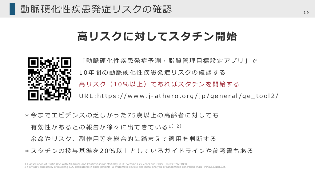 動脈硬化性疾患発症リスクの確認 19 ⾼リスクに対してスタチン開始 「動脈硬化性疾患発症予測・脂質管理⽬標設定アプリ」で 10年間の動脈硬化性疾患発症リスクの確認する ⾼リスク(10%以上)であればスタチンを開始する U R L : h t t p s : / / w w w. j -a t h e r o. o r g / j p / g e n e ra l / g e _ t o o l 2 / *今までエビデンスの乏しかった75歳以上の⾼齢者に対しても 有 効 性 が あ る と の 報 告 が 徐 々 に 出 て き て い る 1)2) 余命やリスク、副作⽤等を総合的に踏まえて適⽤を判断する *スタチンの投与基準を20%以上としているガイドラインや参考書もある 1)Association of Statin Use With All-Cause and Cardiovascular Mortality in US Veterans 75 Years and Older PMID:32633800 2)Efficacy and safety of lowering LDL cholesterol in older patients: a systematic review and meta-analysis of randomised controlled trials PMID:33186535
