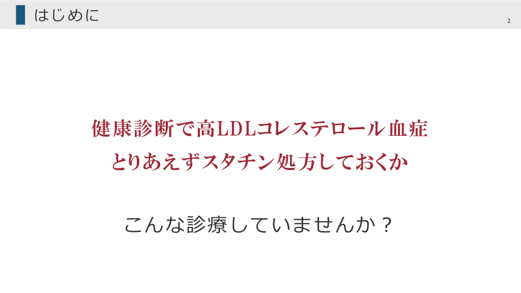 はじめに 2 健康診断で高LDLコレステロール血症 とりあえずスタチン処方しておくか こんな診療していませんか︖