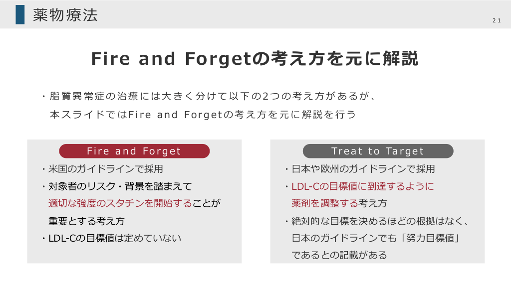 薬物療法 21 Fire and Forgetの考え⽅を元に解説 ・脂質異常症の治療には⼤きく分けて以下の2つの考え⽅があるが、 本スライドではFire and Forgetの考え⽅を元に解説を⾏う Fire and Forget Tr e a t t o Ta r g e t ・⽶国のガイドラインで採⽤ ・⽇本や欧州のガイドラインで採⽤ ・対象者のリスク・背景を踏まえて ・LDL-Cの⽬標値に到達するように 適切な強度のスタチンを開始することが 重要とする考え⽅ ・LDL-Cの⽬標値は定めていない 薬剤を調整する考え⽅ ・絶対的な⽬標を決めるほどの根拠はなく、 ⽇本のガイドラインでも「努⼒⽬標値」 であるとの記載がある
