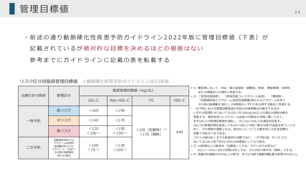 管理⽬標値 23 ・前述の通り動脈硬化性疾患予防ガイドライン2022年版に管理⽬標値(下表)が 記載されているが絶対的な⽬標を決めるほどの根拠はない 参考までにガイドラインに記載の表を転載する リスク区分別脂質管理⽬標値 治療⽅針の原則 ⼀時予防 ⼆次予防 管理区分 *動脈硬化疾患予防ガイドライン2022年版 脂質管理⽬標値(mg/dL) LDL-C Non-HDL-C 低リスク <160 <190 中リスク <140 <170 ⾼リスク <120 <100*1 <150 <130*1 冠動脈疾患または アテローム⾎栓性 脳梗塞(明らかな アテローム*4 を伴う その他の脳梗塞を 含む)の既往 <100 <70*2 <130 <100*2 TG HDL-C <150(空腹時)*3 <175(随時) ≧40 *1)糖尿病において、PAD、細⼩⾎管症(網膜症、腎症、神経障害)合併時、 または喫煙ありの場合に考慮する。 *2)「急性冠症候群」、「家族性⾼コレステロール⾎症」、「糖尿病」、 「冠動脈疾患とアテローム⾎栓性脳梗塞(明らかなアテロームを伴う その他の脳梗塞を含む)」の4病態のいずれかを合併する場合に考慮する。 ・⼀次予防における管理⽬標達成の⼿段は⾮薬物療法が基本であるが、 いずれの管理区分においてもLDL-Cが180mg/dL以上の場合は薬物治療を 考慮する。家族性⾼コレステロール⾎症の可能性も念頭に置いておく。 ・まずLDL-Cの管理⽬標値を達成し、次にnon-HDL-Cの達成を⽬指す。 LDL-Cの管理⽬標を達成してもnon-HDL-Cが⾼い場合は⾼TG⾎症を伴うことが 多く、その管理が重要となる。低HDL-Cについては基本的には⽣活習慣の 改善で対処すべきである。 ・これらの値はあくまでも到達努⼒⽬標であり、⼀次予防(低・中リスク)に おいてはLDL-C低下率20-30%も⽬標値としてなり得る。 *3)10時間以上の絶⾷を「空腹時」とする。ただし⽔やお茶など カロリーのない⽔分の摂取は可とする。それ以外の条件を「随時」とする。 *4)頭蓋内外動脈の50%以上の狭窄、または⼸部⼤動脈粥腫(最⼤肥厚4mm以上)