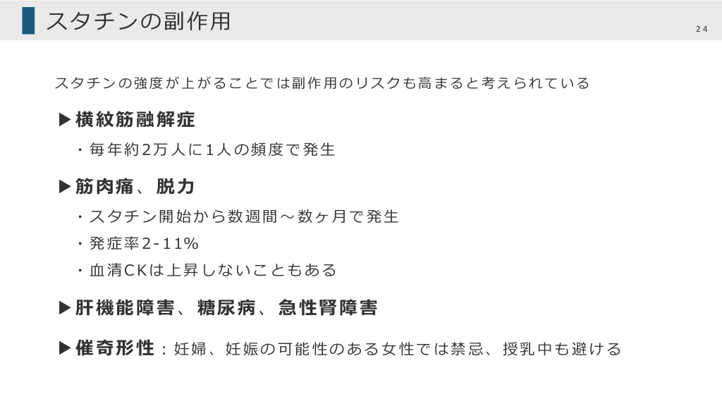 スタチンの副作⽤ スタチンの強度が上がることでは副作⽤のリスクも⾼まると考えられている ▶横紋筋融解症 ・毎年約2万⼈に1⼈の頻度で発⽣ ▶筋⾁痛、脱⼒ ・スタチン開始から数週間〜数ヶ⽉で発⽣ ・ 発 症 率 2 - 1 1% ・⾎清CKは上昇しないこともある ▶肝機能障害、糖尿病、急性腎障害 ▶催奇形性︓妊婦、妊娠の可能性のある⼥性では禁忌、授乳中も避ける 24