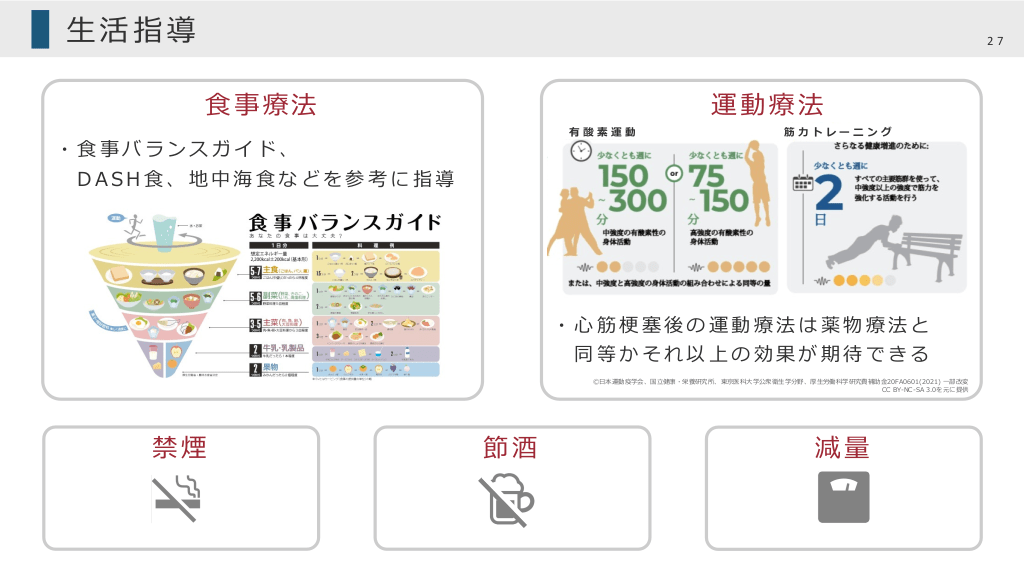 ⽣活指導 27 ⾷事療法 有酸素運動 ・⾷事バランスガイド、 運動療法 筋⼒トレーニング DASH⾷、地中海⾷などを参考に指導 ・⼼筋梗塞後の運動療法は薬物療法と 同等かそれ以上の効果が期待できる Ⓒ⽇本運動疫学会、国⽴健康・栄養研究所、東京医科⼤学公衆衛⽣学分野、厚⽣労働科学研究費補助⾦20FA0601(2021) ⼀部改変 CC BY-NC-SA 3.0を元に提供 禁煙 節酒 減量