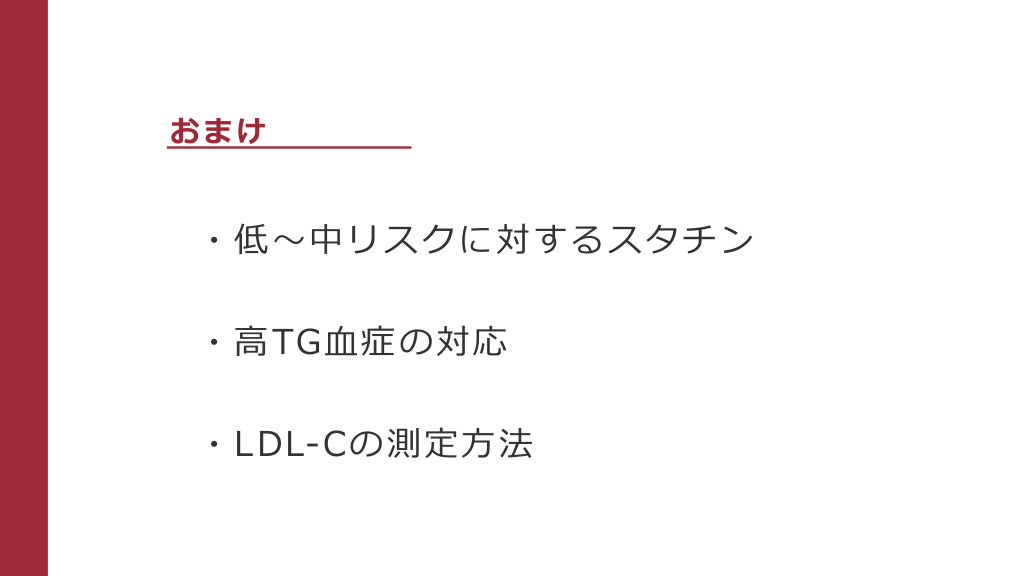 おまけ ・低〜中リスクに対するスタチン ・⾼TG⾎症の対応 ・LDL-Cの測定⽅法