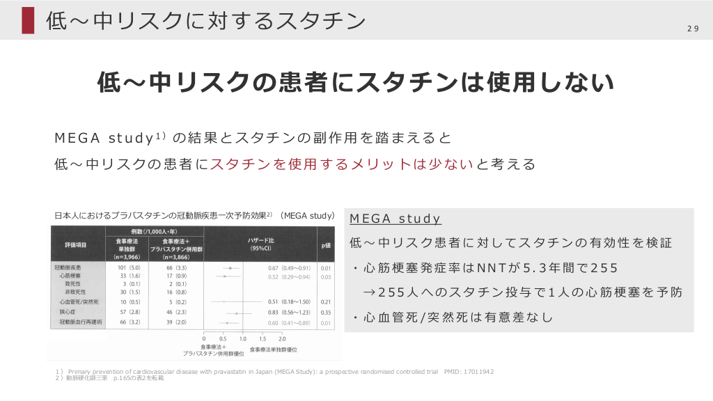 低〜中リスクに対するスタチン 低〜中リスクの患者にスタチンは使⽤しない M E G A s t u d y 1)の 結 果 と ス タ チ ン の 副 作 ⽤ を 踏 ま え る と 低〜中リスクの患者にスタチンを使⽤するメリットは少ないと考える ⽇本⼈におけるプラバスタチンの冠動脈疾患⼀次予防効果2) (MEGA study) MEGA study 低〜中リスク患者に対してスタチンの有効性を検証 ・⼼筋梗塞発症率はNNTが5.3年間で255 →255⼈へのスタチン投与で1⼈の⼼筋梗塞を予防 ・⼼⾎管死/突然死は有意差なし 1) Primary prevention of cardiovascular disease with pravastatin in Japan (MEGA Study): a prospective randomised controlled trial PMID: 17011942 2)動脈硬化御三家 p.165の表2を転載 29